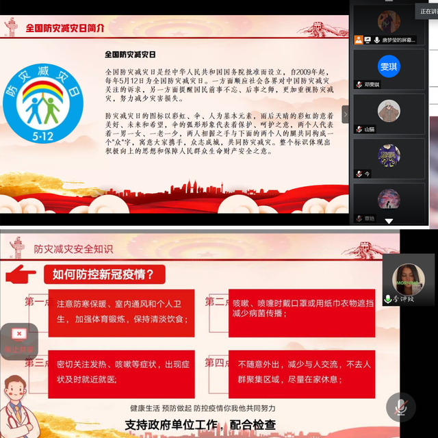 此次主题班会主要给学生普及全国防灾减灾日的由来、国家对于防灾减灾的相关工作部署、应对地震、火灾、泥石流等自然灾害的防灾减灾小知识等,结合当前疫情防控要求,提醒同学们正确佩戴口罩、不聚集、勤洗手,科学做好自身安全防护工作。班会中不少同学积极分享了在汶川地震以及疫情防控的亲身经历及应急心得。同学们也纷纷表示,防灾减灾工作不只是国家的责任,更是我们每一位公民都应该树立的意识并付诸实践。