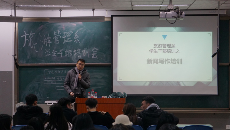 为进一步推进宣传报道工作,创新宣传方法、提高宣传效果,加强学生宣传队伍写稿能力,2019年1月2日晚七点十分,由旅游管理系举办的学生干部系列培训讲座之二——“互联网+宣传工作”在6B201教室举行。本次讲座邀请苏丙杰老师为大家授课,来自旅游管理系的全体学生干部参加此次讲座。