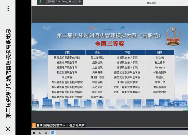 近日,由尖锋时刻组委会、青岛酒店管理职业技术学院及灏悦程信息科技南京有限联合举办的第二届“尖锋时刻”酒店管理模拟大赛(高职组)在线上展开激烈角逐,来自全国高校69支学生参赛队伍参加了此次比赛。旅游管理系2支队伍荣获本届赛事全国三等奖。