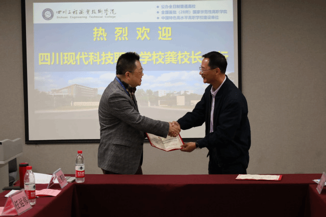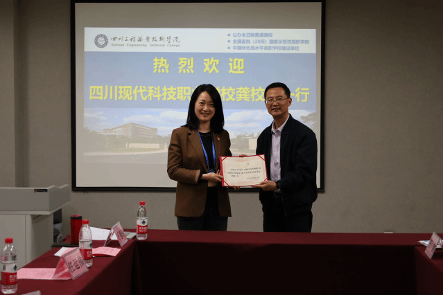 随后,双方在旌湖尚品酒店召开专业建设交流恳谈会。在观看了旅游管理系文化育人微电影之后,张伟主任详细介绍了旅游管理系概况、双高专业群建设情况及人才培养成效,获得来宾一致认可。龚校长也就四川现代科技职业学校的建设与发展概况做了简要介绍,并提出了此次考察的目的及诉求,希望通过此次交流,学习一些专业建设方面成功的方法和经验。最后,龚校长颁发了聘请张伟主任和杨惠玲副主任为四川现代科技职业学校旅游专业专家指导委员会委员的聘书,期待未来能开展更多的合作。