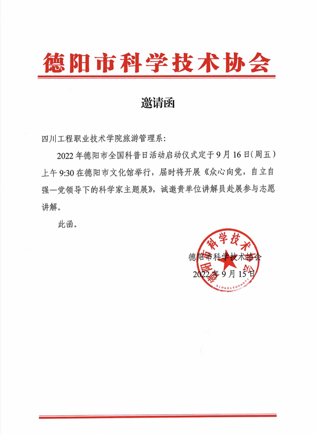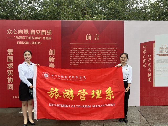 由中国科学技术协会、中华人民共和国科学技术部、中国科学院、中国工程院、国家国防科技工业局、中国国家博物馆共同主办,由北斗航天卫星应用技术集团有限公司等47家单位协办的众心向党·自立自强——党领导下的科学家”主题展览于9月16日在德阳文化馆举行,活动旨在普及科学知识、弘扬科学精神、传播科学思想,进一步提高全民科普知识储备,激发科技创新创造活力。我系旅游管理专业学生受德阳市科学技术协会邀请赴展参与志愿讲解工作。