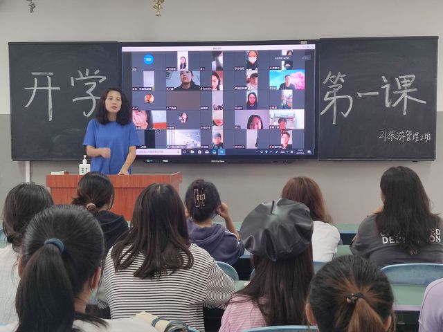 由于疫情影响部分学生暂缓返校,开学第一课采用线上线下结合的方式,不能到场的学生使用腾讯会议参与到学习互动当中。