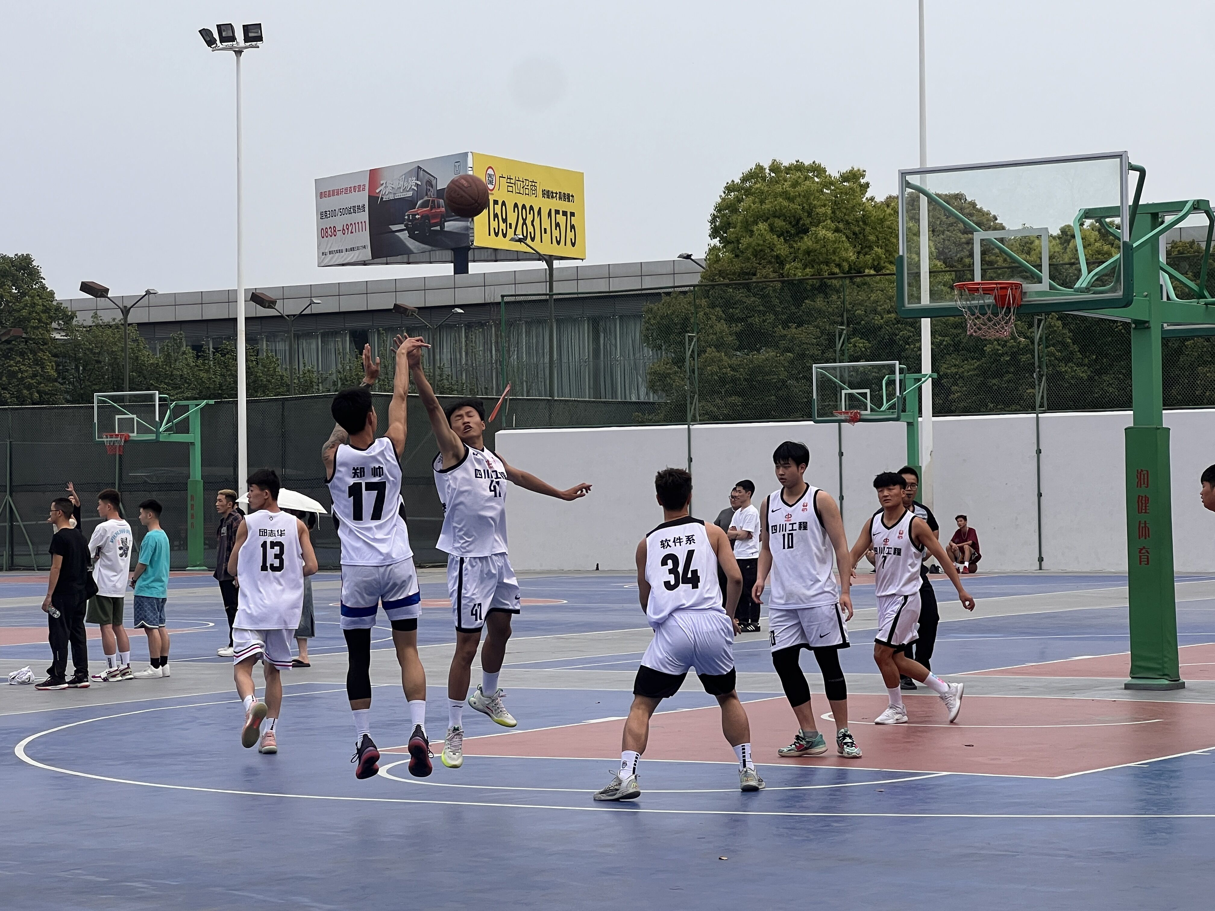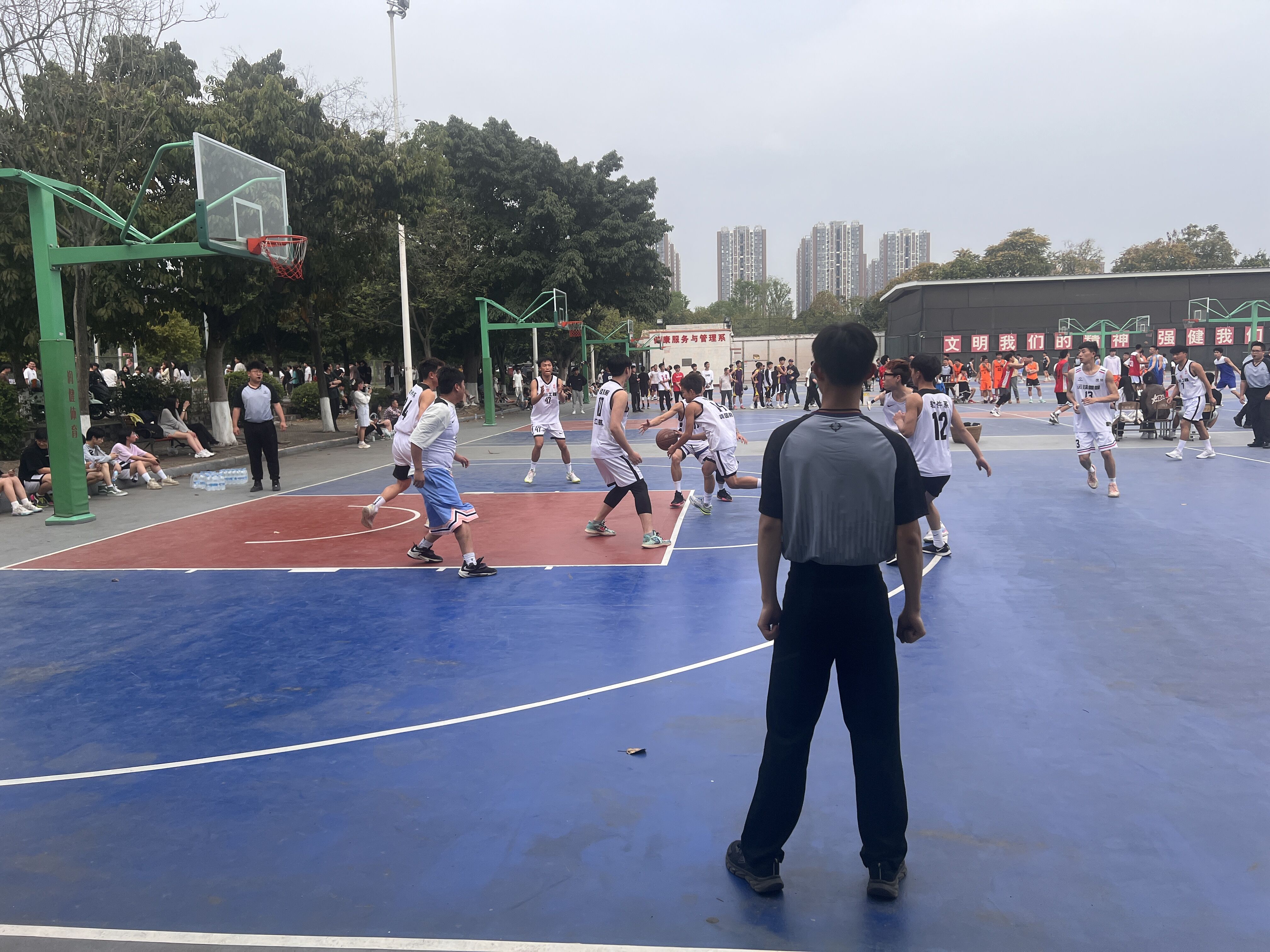 随着裁判的哨响,整个球场就充满了紧张的气氛,我系球员的激情全都淋漓尽致的体现在篮球场上。场上,双方拼抢很激烈,带球、运球、投篮等一系列动作潇洒、规范。他们全力以赴,积极防守、积极进攻,越战越勇。两旁的同学也情绪高涨、摇旗呐喊,不时为队员打气、喝彩,气氛热烈。历经2个多小时的激励奋战,我系球员顾大局,识大体、服从裁判、赛出了风格、赛出了水平,充分展示着我系球员良好的精神风貌。
