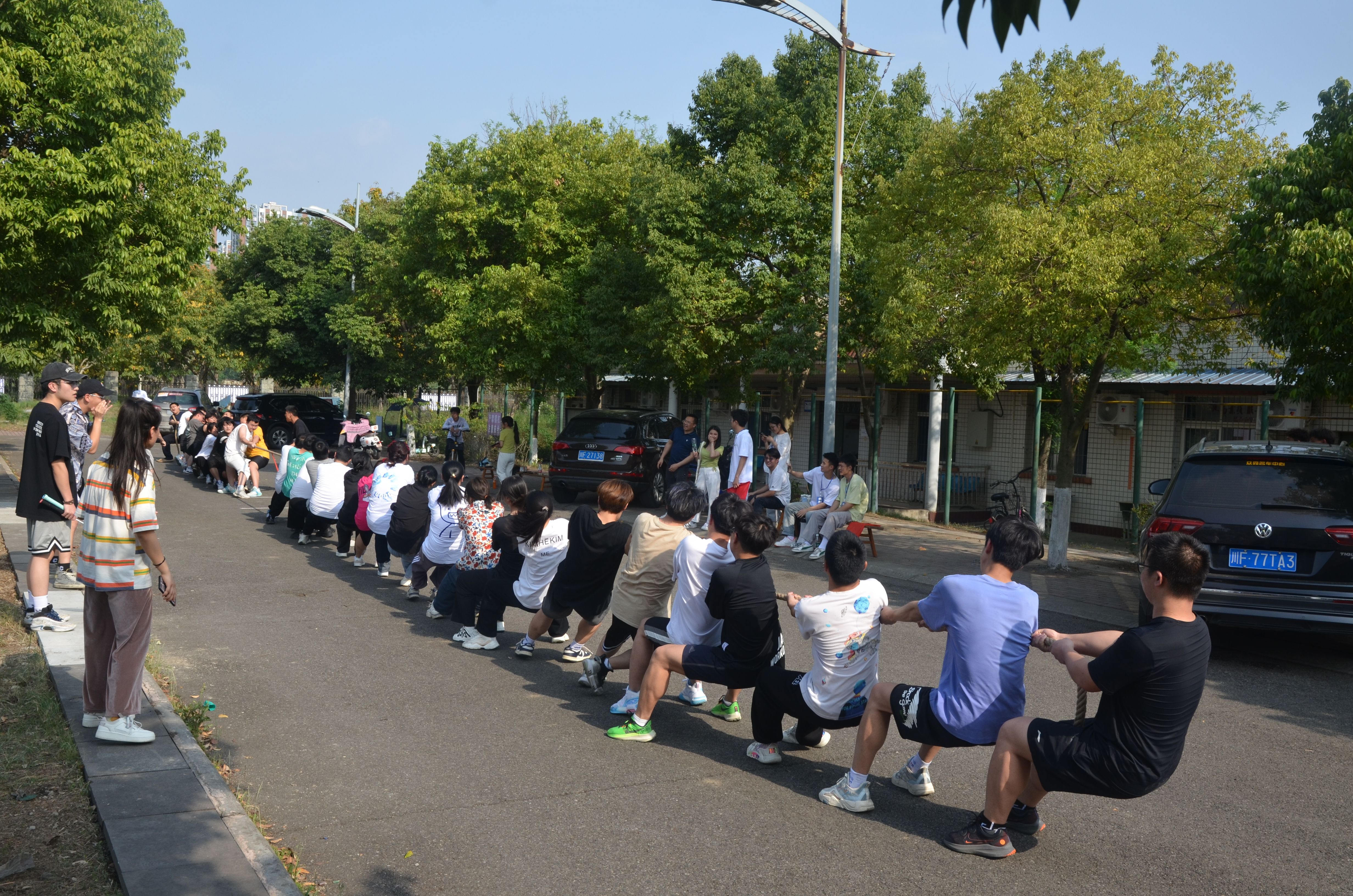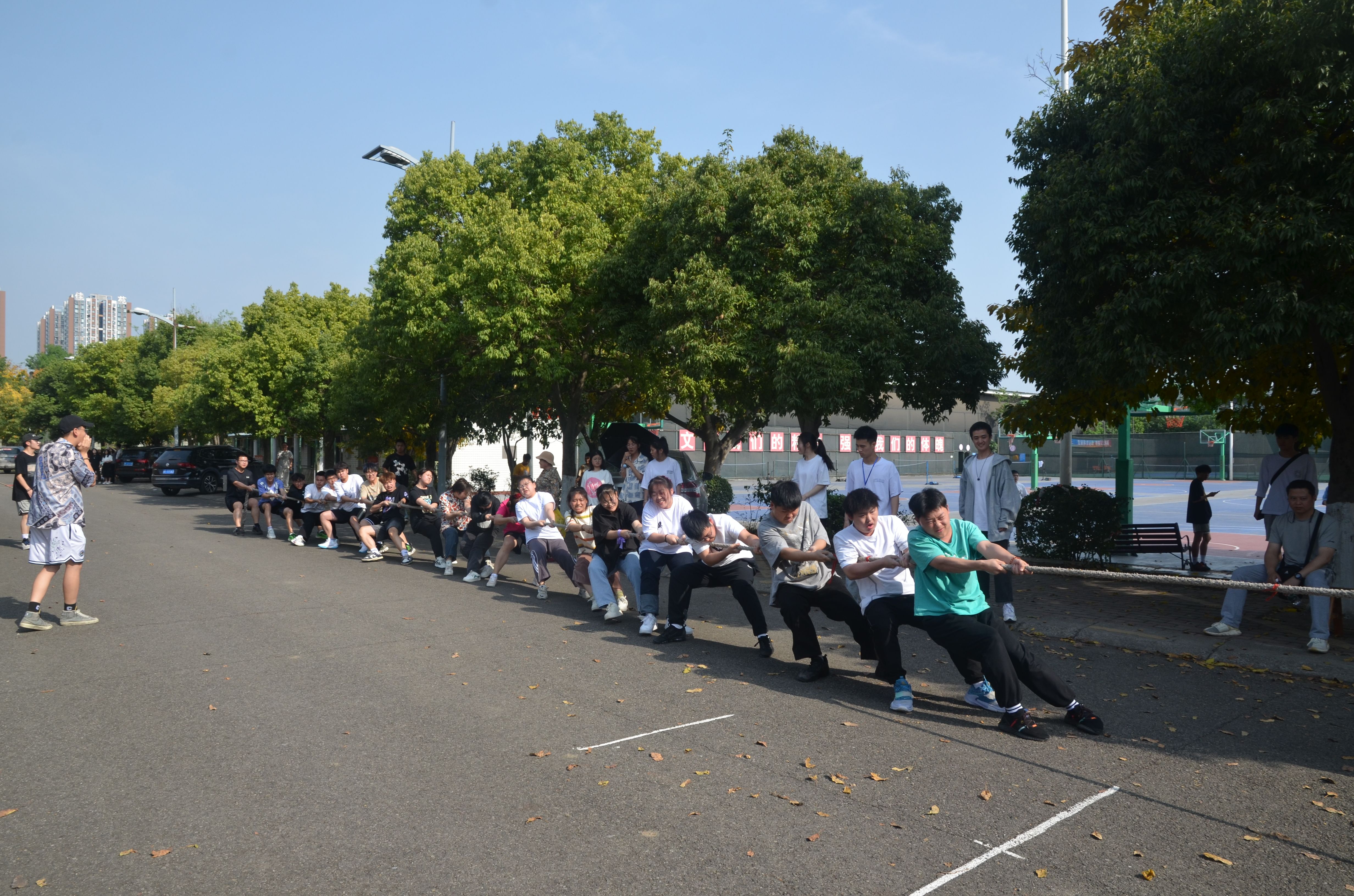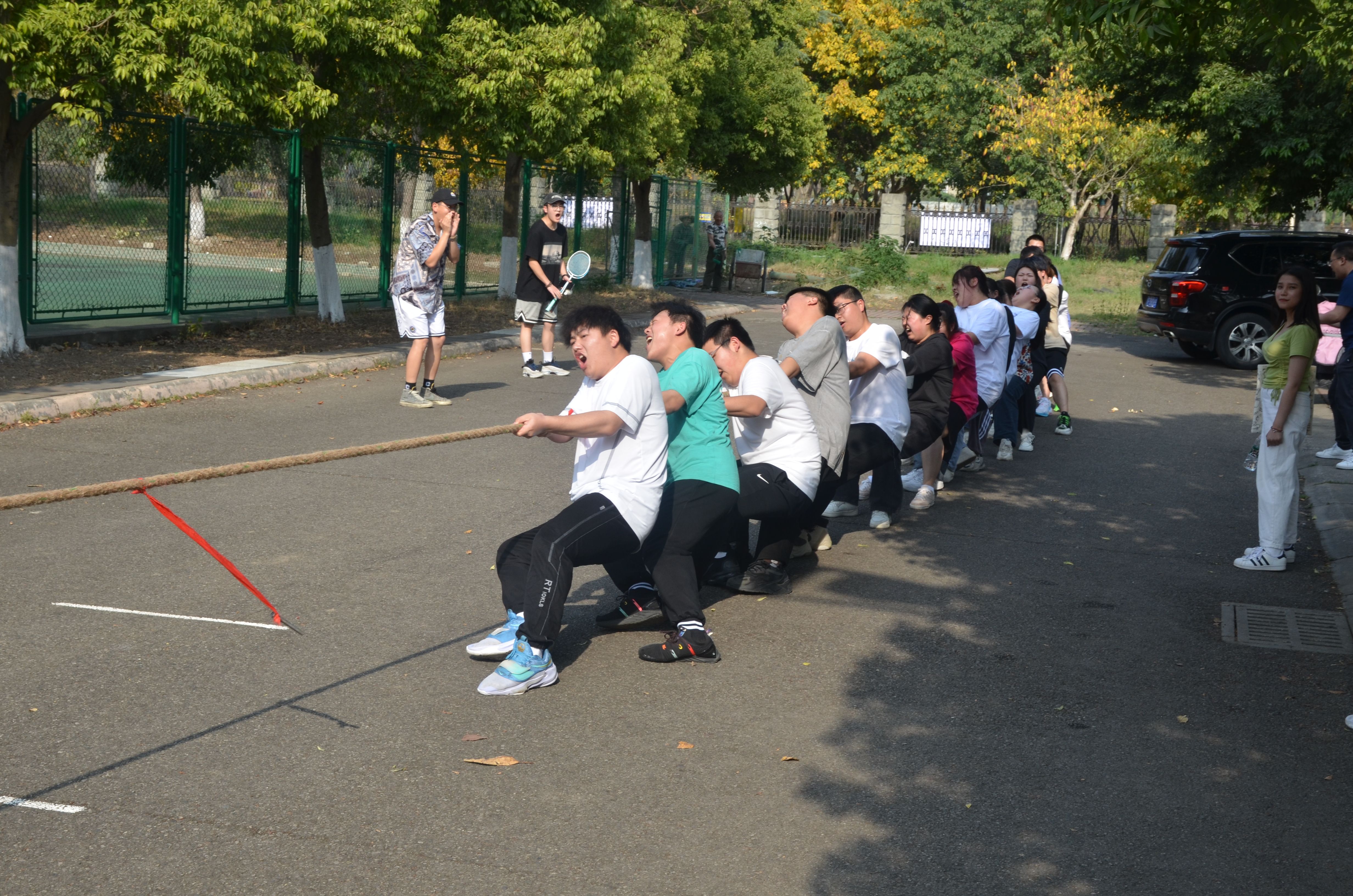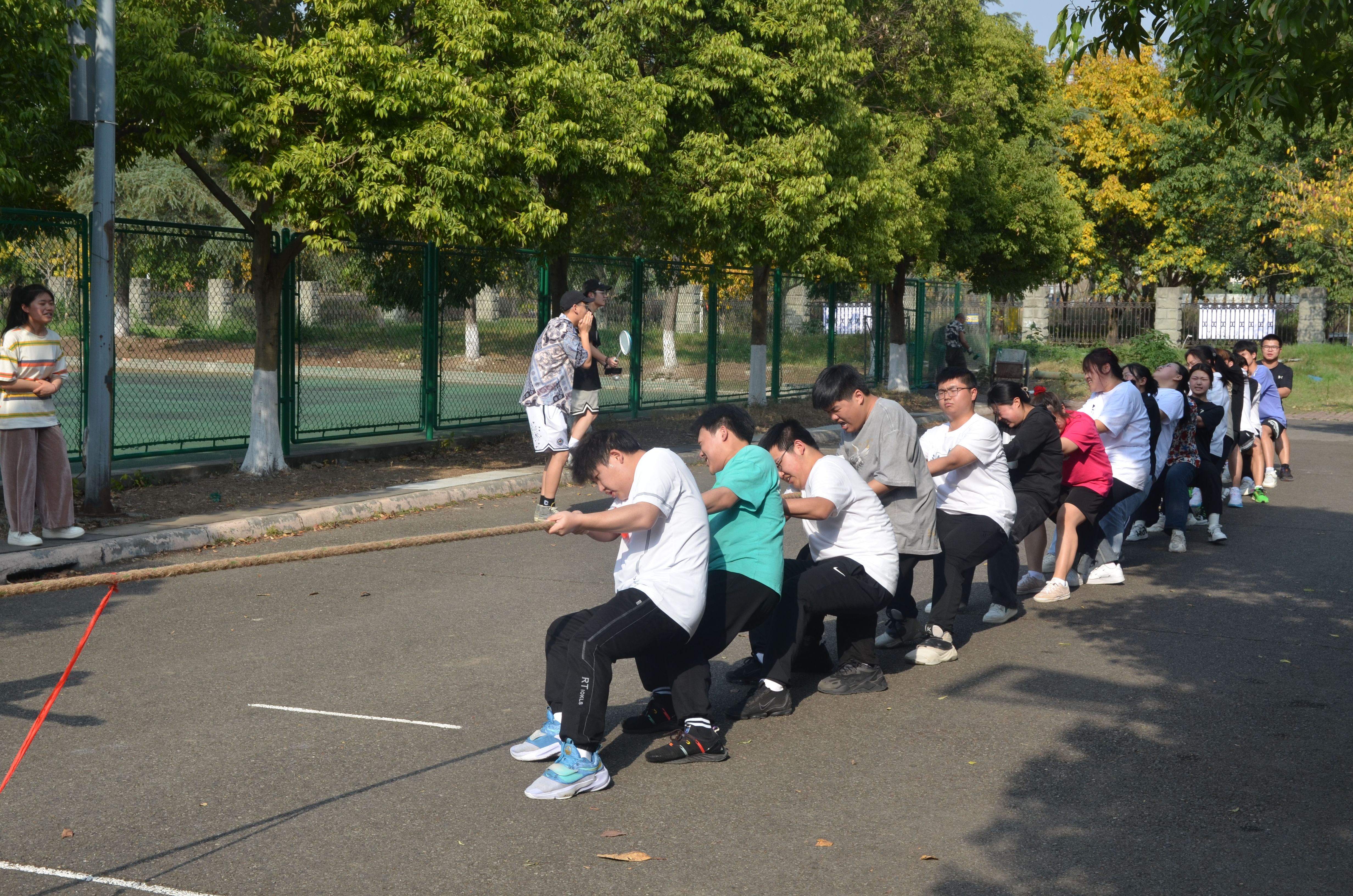 赛前,我系参赛同学在相关负责人的带领下进行了热身运动,防止在正式比赛中受伤。比赛开始后,每位队员都展现出顽强的意志和拼搏精神,他们齐心协力,注重团队合作,喊着一致的口号,在口号声中一齐用力。现场观众好似也被热烈的气息鼓舞,纷纷为参赛队员们加油呐喊。在同学们的呐喊助威下,他们鼓足了劲,涨红了脸,抓紧绳子,全力以赴,努力争夺。加油声、叹息声、欢呼声,此起彼伏,好不热闹。