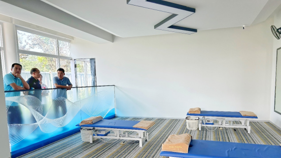在第一防护公司联合创始人兼西南区域负责人黄俊烨的陪同下,现场调研了足球场、羽毛球馆、运动防护馆等场地,随后在会客室进行了座谈,并针对运动防护专业课程建设、学生就业、教师发展等方面进行了经验交流,切身体验体姿体态评估系统、现场考察拉伸全过程。