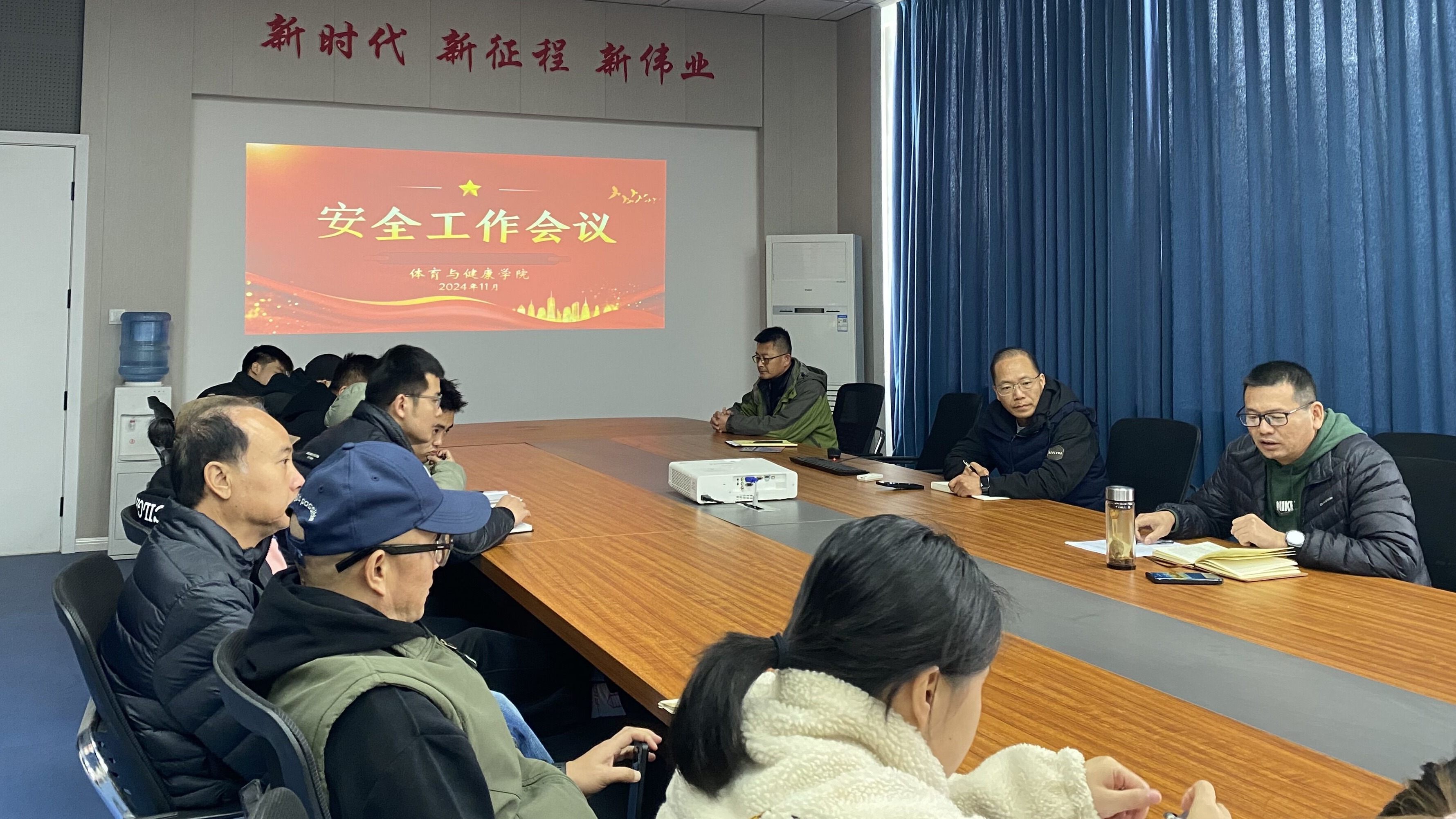 2024年11月19日,体育与健康学院组织召开安全工作会议,会议旨在进一步提升全院师生的安全意识,压实安全责任,确保校园安全稳定。此次会议由学院党总支书记谢飞主持,学院全体教职工参加了会议。