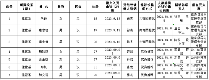 经健康服务与管理系团总支推荐、党员推荐,健身指导与管理专业党支部、公共体育党支部综合考察、支委会研究,拟确定唐忠恒等三名学生、母颖鸿等四名老师为入党积极分子,现将其基本情况予以公示。在公示期内,欢迎广大党员、干部、群众通过电话(0838-2650327)或直接到健身指导与管理专业党支部、公共体育党支部或系党总支办公室反映公示对象在思想品质、现实表现、廉洁自律等方面的情况。公示时间2024年4月8日至12日,共计5个工作日。