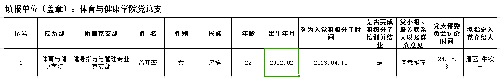 经推荐,健身指导与管理专业党支部委员会讨论,体育与健康学院党总支研究决定,拟确定曾邦蕊为2024年上半年发展对象,现将其基本情况予以公示,公示时间2024年5月27-31日。公示期内,欢迎广大党员、干部、群众通过信函、电话或直接到体育与健康学院党总支反映公示对象思想品质、现实表现、廉洁自律、培养教育等方面的情况。联系电话:0838-2650327。