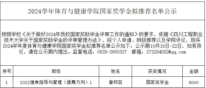 2024学年体育与健康学院国家奖学金拟推荐名单公示