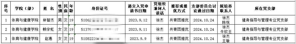 经体育与健康学院团总支推荐,健身指导与管理专业党支部综合考察、支委会讨论,拟吸收赵惠等三名学生为入党积极分子,现将其基本情况予以公示。在公示期内,欢迎广大党员、干部、群众通过电话(0838-2650327)或直接到健身指导与管理专业党支部或系党总支办公室反映公示对象在思想品质、现实表现、廉洁自律等方面的情况。公示时间2024年10月24日至30日,共计5个工作日。