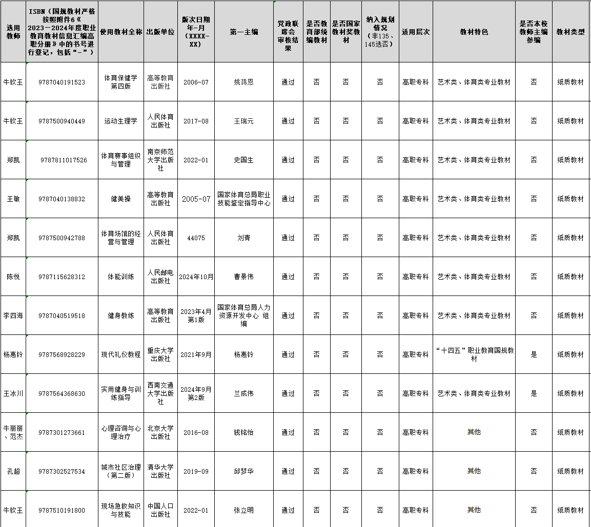 体育与健康学院2024-2025-2学期教材选用清单公示