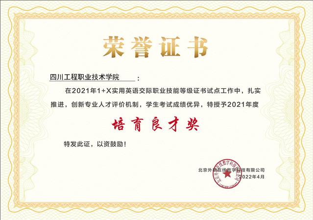 在2021年1+X实用英语交际职业技能等级证书试点工作中,全国10所职业高院获得北京外研在线数字科技有限公司年度表彰。其中,四川工程职业技术学院扎实推进,创新专业人才评价机制,学生考试成绩优异,被北京外研在线数字科技有限公司授予2021年度“培育良才奖”。(文:姜雯玉)