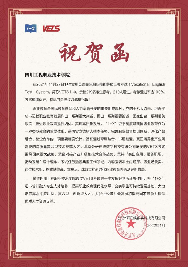 在2021年11月27日举行的1+X实用英语交际职业技能等级证书考试(Vocational English Test System, 简称VETS)中,我校商务英语, 应用英语,旅游英语三个专业共219名同学参考,219人通过,考核通过率100%。