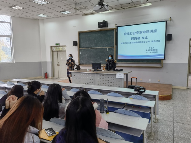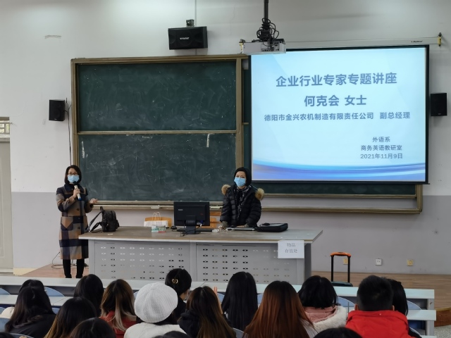 11月8日下午和9日上午,外语系在3A208举行了企业行业专家外贸实务专题讲座,邀请到了四川美瑞斯国际贸易有限公司总经理赵秋凤女士、德阳市金兴农机制造有限责任公司副总经理何克会女士两位企业专家主讲。
