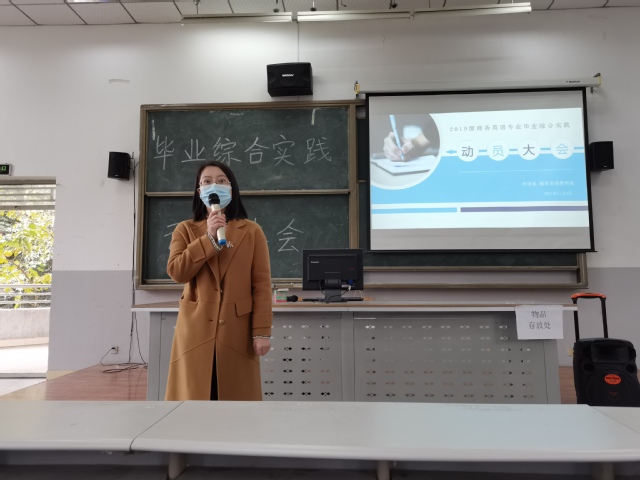 大会开始,蒋显伦主任针对当前疫情,希望同学增强重视程度,提醒大家严格做好疫情防控工作。其次,强调了毕业综合实践的重要性、必要性以及具体要求,要求同学们提高认识,做好准备,认真对待此次为期5周的毕业综合实践,增强对本学科专业领域的感性认识,巩固大学期间所学到的商务英语专业知识,并对自己的职业有一个明确的规划。随后,商务英语教研室主任钟敏老师详细阐述了毕业综合实践的任务安排和考勤管理要求,希望同学们多与指导老师进行交流沟通,认真完成毕业综合实践任务,将近三年的“英语+商务”理论知识付诸实践,学会如何用专业知识的角度去独立分析问题和解决问题。此次动员大会让同学们对毕业综合实践具体任务有了更加清晰的认识,目标也更加明确。