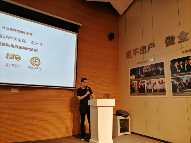 为帮助同学们进一步认识跨境电商,公司负责人熊总在会议室就本公司运营情况进行讲解。他谈到,目前公司聚合了线上线下贸易活动,已构建了较为完整和先进的物流、金融、大数据、人才、品牌、文化等全产业链服务生态体系。公司面向“一带一路”国家,推出了“跨境电商+一般贸易、线上询盘、数据整合+线下集采交易”的综合模式,让中国制造的产品走向全世界。