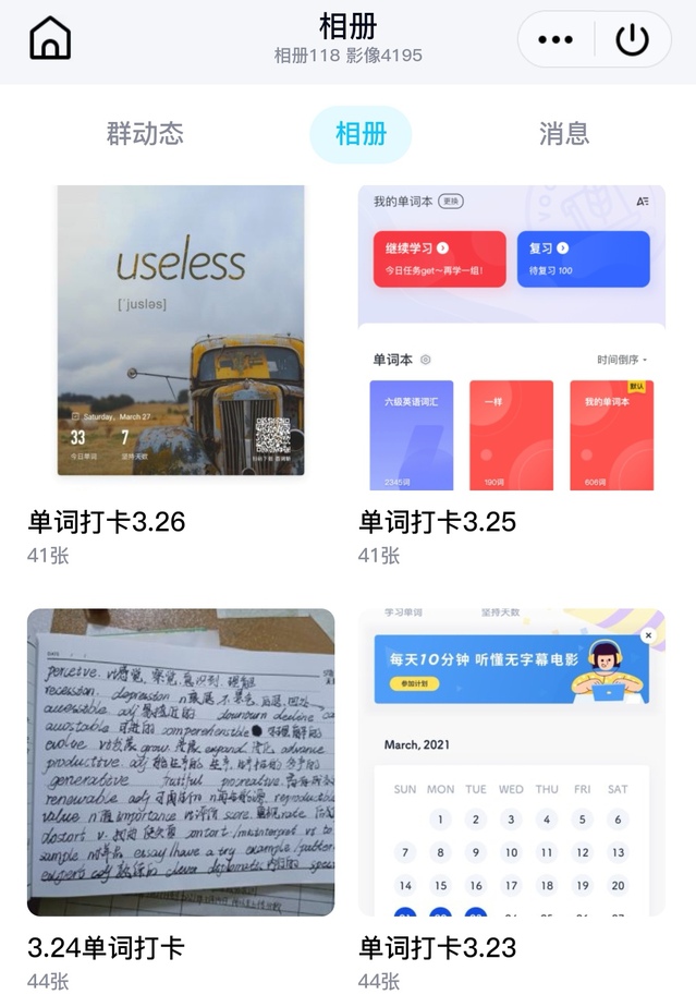 同学们每天将所背诵单词的截图或者其他凭证,上传至“腾讯”打卡相册中。由室长统计所在寝室同学的学习情况并记录在案。荀子说:“不积跬步,无以至千里,不积小流无以成江海。齐骥一跃,不能十步,驽马十驾,功不在舍。”经过了一个月的“打卡”学习,同学们纷纷表示收获很多。班长宋千禧说:“作为英语专业的学生,背单词的过程就是一个词汇积累的过程,从unknown到acquainted再到established。如果每天固定背30-40个单词,第二天在复习前一天单词的基础上,继续背诵30-40个。持之以恒,日积月累,我相信一定会有很大的效果。”(文/图 2019级应用英语一班 蒋小艺、梁华琼 /钟煊美)