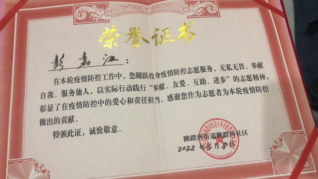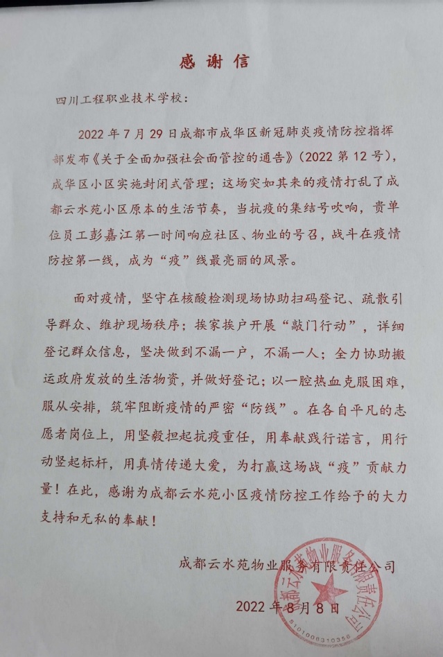 近日,一封落款时间为2022年8月8日的感谢信几经辗转来到了学校。这封迟来一个多月的信感谢的是一位叫彭嘉江的工院人,他在7月中旬成都成华区疫情全区封控时,第一时间响应社区、物业的号召,报名成为志愿者,战斗在疫情防控第一线,成为“疫”线最亮丽的风景。