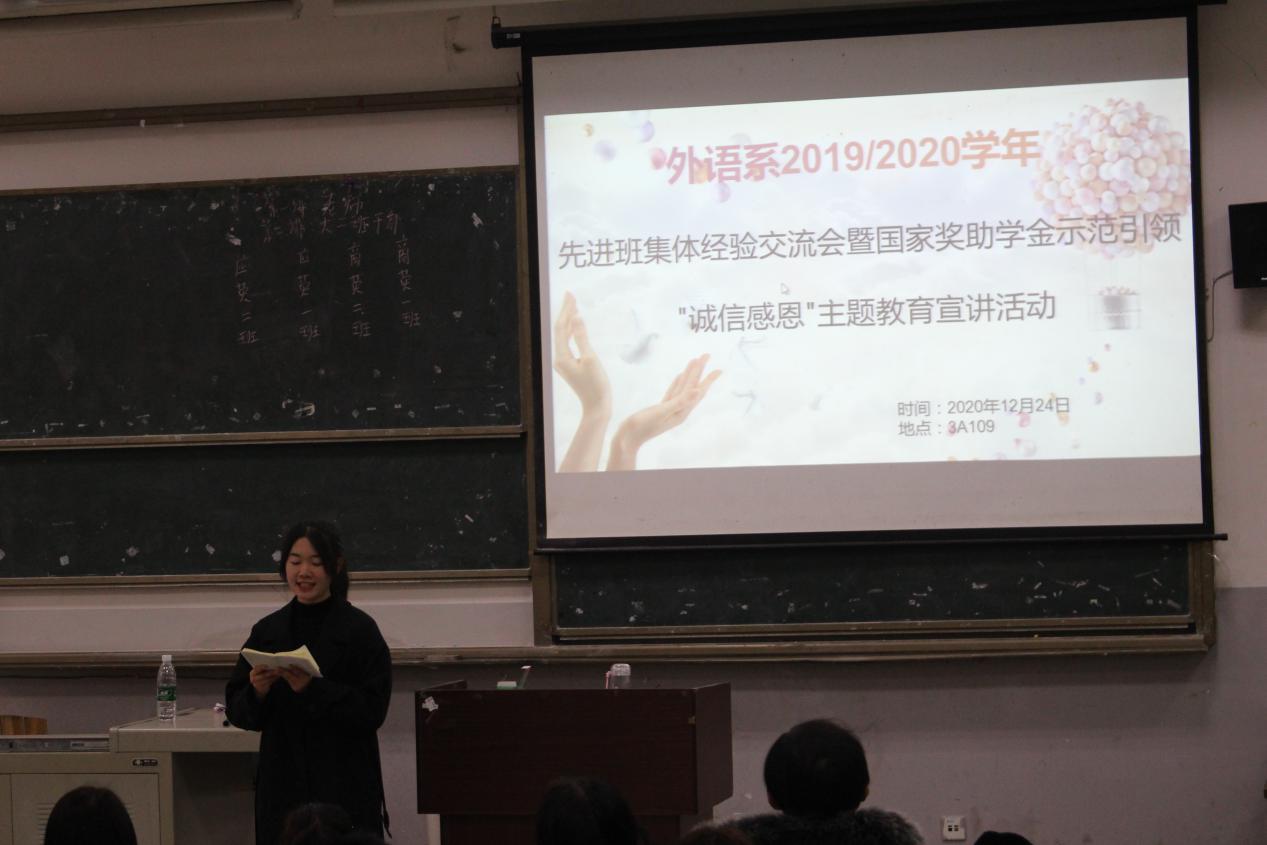 为营造良好的班级氛围和促进同学综合素质的发展,我系于2020年12月24日下午四点半在三教A109阶梯教室开展了2019/2020学年先进班集体经验交流会暨国家奖助学金“诚信.感恩”主题教育活动。本次活动由外语系党总支王春焱书记、全体班导师、班主任、辅导员老师及20级全体同学、18级、19级各班级班委代表参加,外语系2019级商务英语一班王帮兰担任主持。