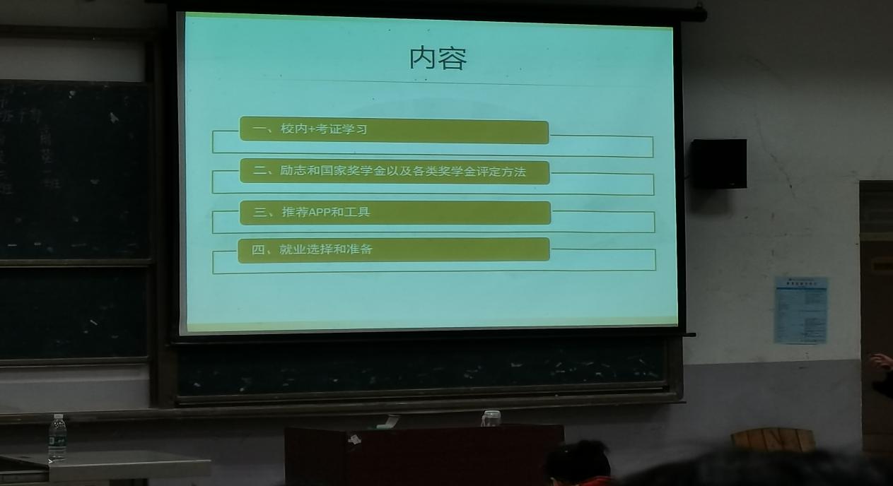 会议第三项,由获得国家奖学金的2018级商务英语一班的蒋希学姐进行她的学习经验分享与交流。交流主要分为四个部分,分别是“校内加考证学习”、“励志和国家奖学金以及各类奖学金评定方法”、“推荐APP和工具”、“就业选择和准备”,这让我们明白了应该如何学习及如何才能获得奖学金,是一次非常有用的交流会。