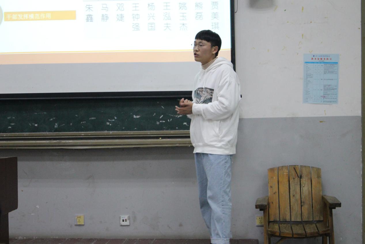会议第二项由先进班集体2019级城市轨道交通机电技术2班的班长带来他的分享。他通过“班级简介”、“党团建设”、"'“班风建设”、“学风建设”、“舍风建设”“素质拓展”、“特色与亮点”这七个方面来展现班级风采,并强调德智体美劳全面发展的重要作用,让同学们意识到班委在班上的重要性,同时一个班上的良好风气不只需要班委良好的带头作用,也需要同学们的严格律己,相互监督,共同进步。