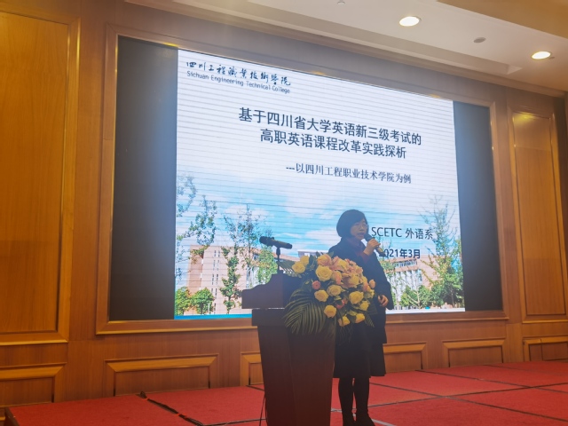 我系苏玉仙教授在会上应邀做“上下联动,测评促教”为主题的专题报告,介绍了我校对于四川新三级考试的教学和教研相关举措,分享以四川新三级考试为引领,我院如何将教、考、研有机结合,实现师生共同成长,探索职业院校英语教学改革的经验。