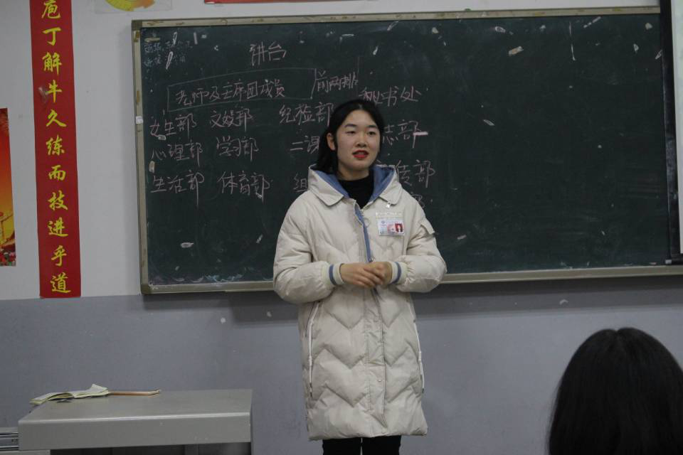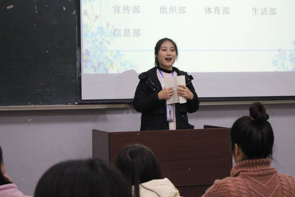 大会第三项,由王帮兰同学介绍新一任各部门部长。青志部、女生部、信息部等13个部长依次向各位老师及同学问好。