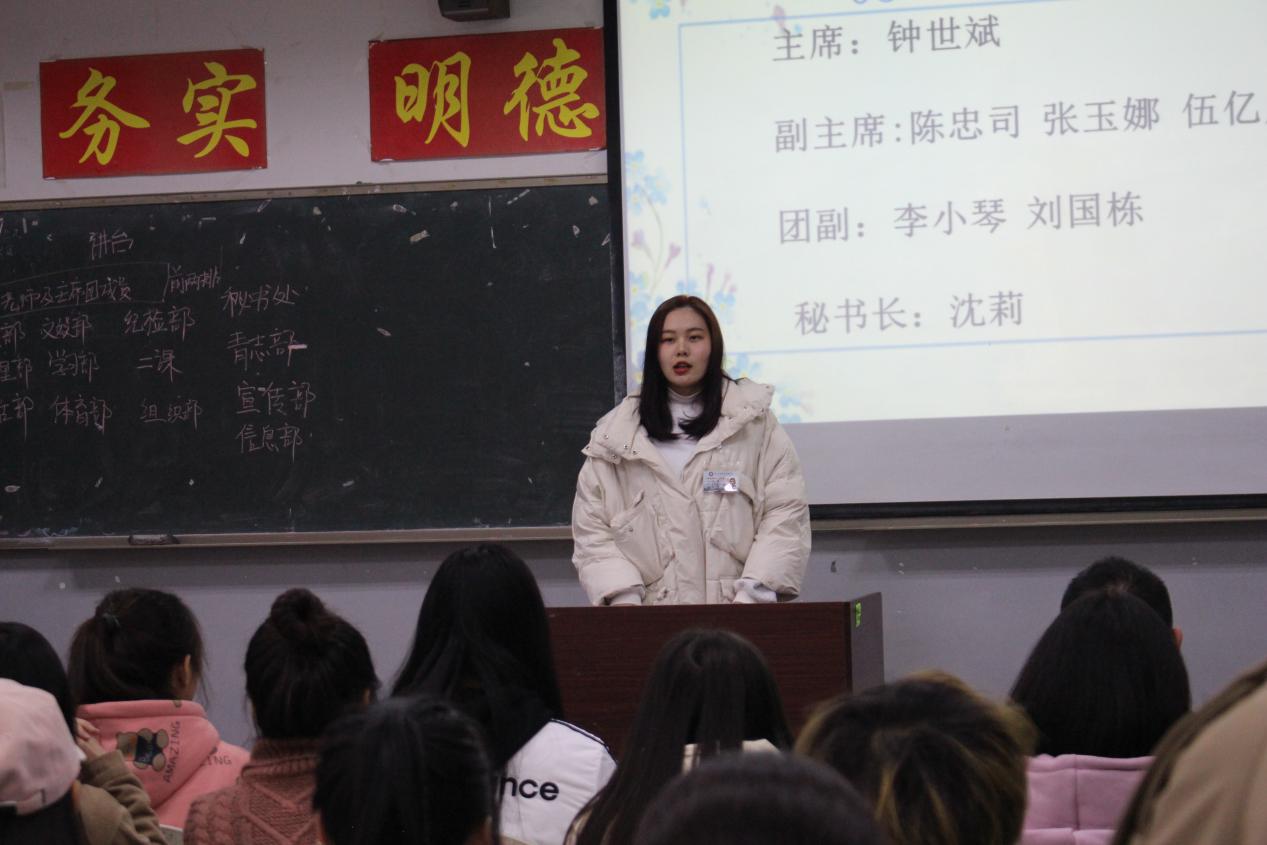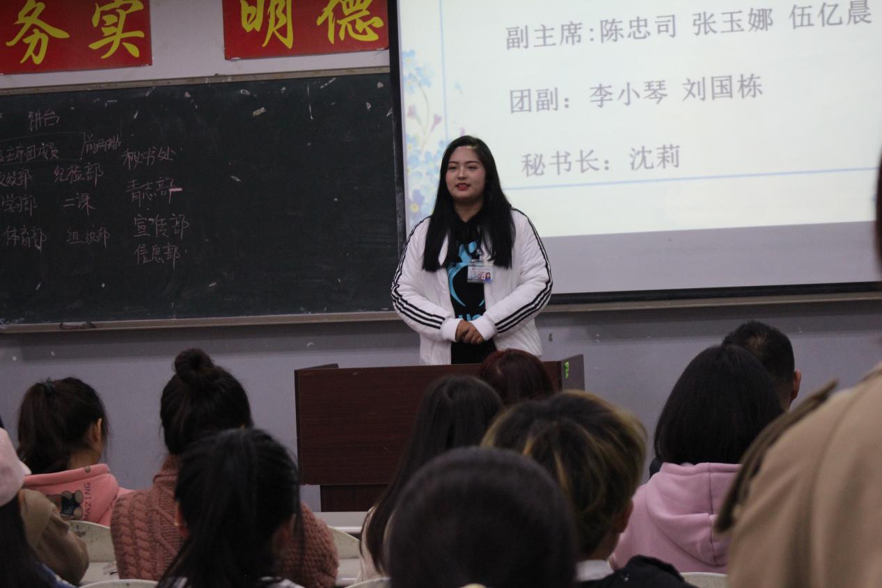 大会第二项,由19级新任学生会主席周瑞同学,副主席匡琳同学、李莹萍同学、余炊充同学、范琼方同学,团副袁婷婷同学、钟琪同学,秘书长王帮兰同学分别发表感言。其中副主席李莹萍同学就院上最新开会内容进行告知。各个主席团成员都建议大家多参加各类活动以及比赛,积极做事,踊跃表现自己。另外还特意强调,我们虽身处不同部门,但我们要做到分部不分家,互帮互助,各司其职、认真负责。教室内掌声不断,将大会推向一个又一个高潮。