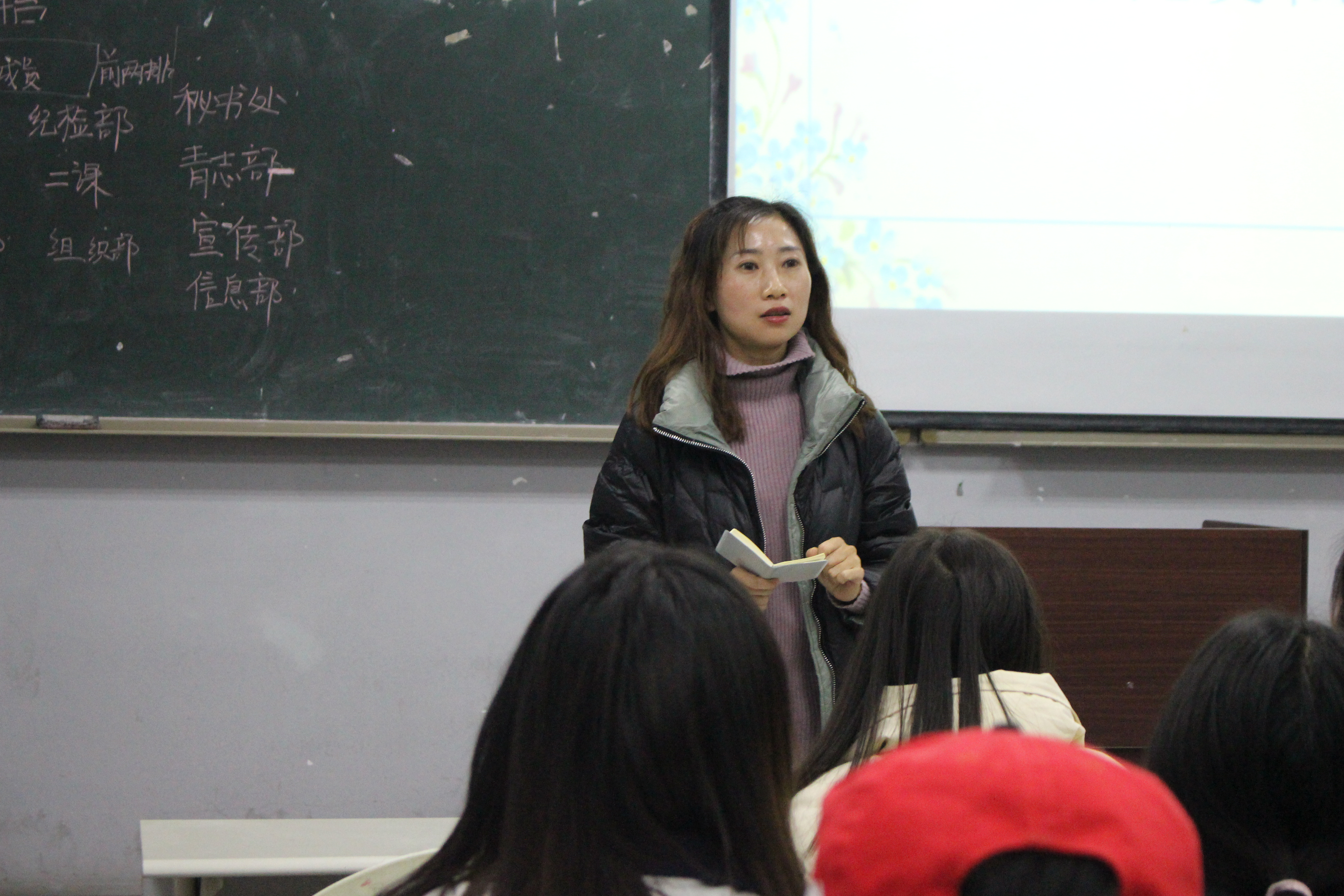 大会第六项,团总支书记唐蕊老师发言。她分为三个部分,首先是考勤,系部一月或两月开一次大会,希望同学们能够积极参与。平时可以多去和老师沟通,一八级主席团非常优秀,在全院团总支排名第一,希望我们可以像他们靠近,但本月我们系部却位于第六,所以十二月份开始整改。其次,希望同学们多上台锻炼语言表达能力,保持积极的工作态度,同时杜绝官僚主义作风,摆正自己的位置。本次在各部门的协作下艺术节和科技节开展十分成功,感谢大家的辛勤付出。最后,唐老师安排了主席团成员及各部门下个月的工作,使其明确责任,将工作做到最好。