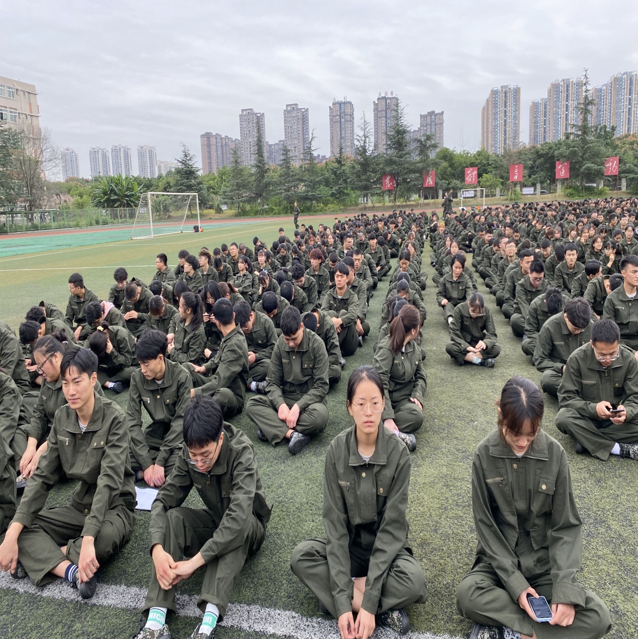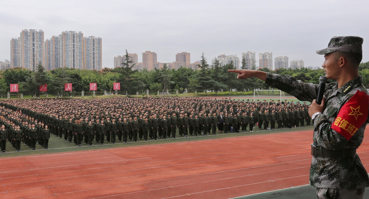 绿油油的草地上,一群身穿绿色工装的活力青年整齐的站着军姿,有力的踏着正步,喊着响亮的口号,唱着激昂的军歌。同学们在英姿飒爽的教官的带领下认真训练,丝毫没有半点偷懒。古人言:“古之立大事者,不惟有超世之才,亦必有坚忍不拔之志” ,在那里同学们会洒下辛勤的汗水,收获的将是铁一般的体魄,刚一般的意志,雷厉风行的作风,坚定不移的毅力,这些都将是一个成大事者必备的条件,它将是同学们整个大学生活中乃至一生中无比宝贵的财富。走进操场时,第一眼就看到了外语系正随风飘荡着的系旗,各班辅导员老师就站在身旁,很认真的看着自己的学生训练。当走近时,我系新生格外引人注目,站姿笔直,走步铿锵有力。