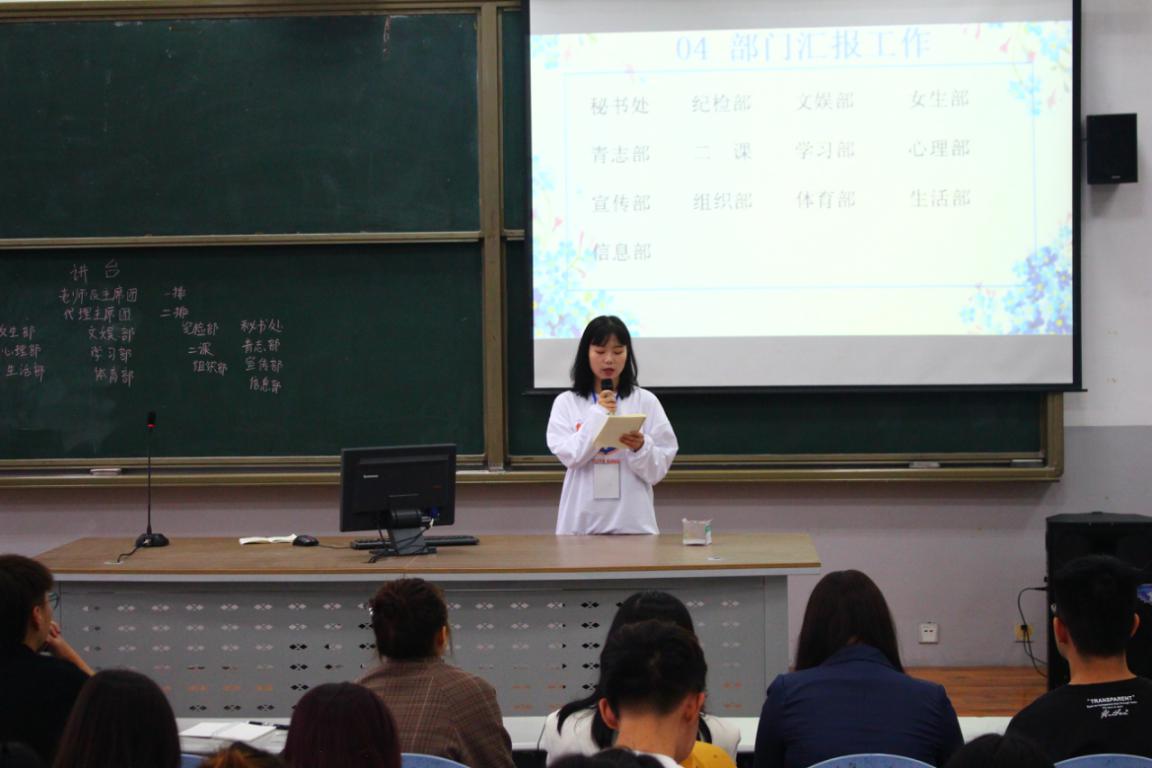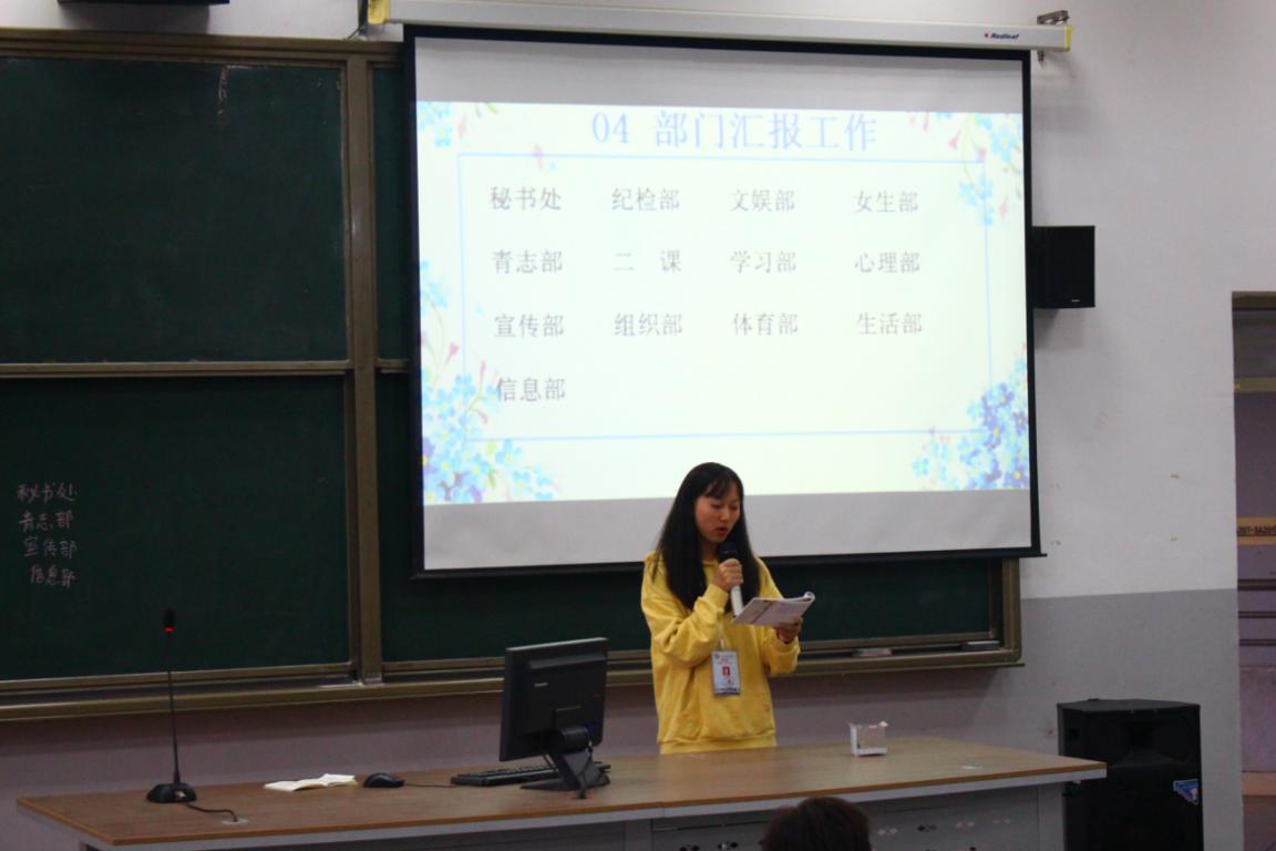 大会第三项由各部门汇报工作。青志部、宣传部、信息部等13个部门的代理部长分别上台作部门总结与规划。展示了各自部门上个月的工作成就和不足,发扬做得好的地方,及时改正欠缺的部分。除了反思之外,也对接下来的工作作出规划,有目的、有条理的完成每一项任务。