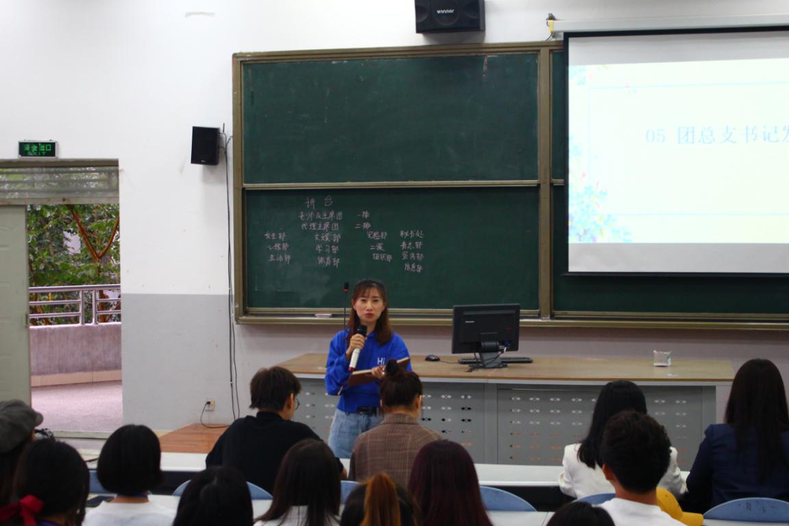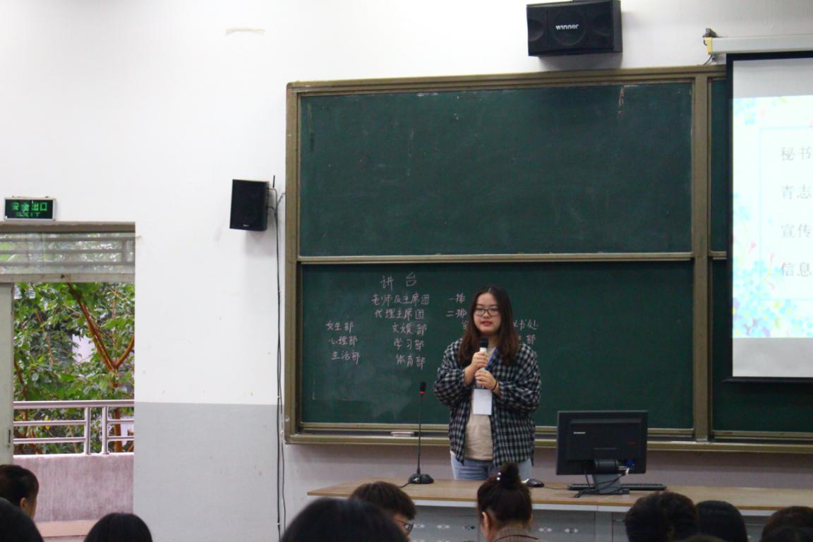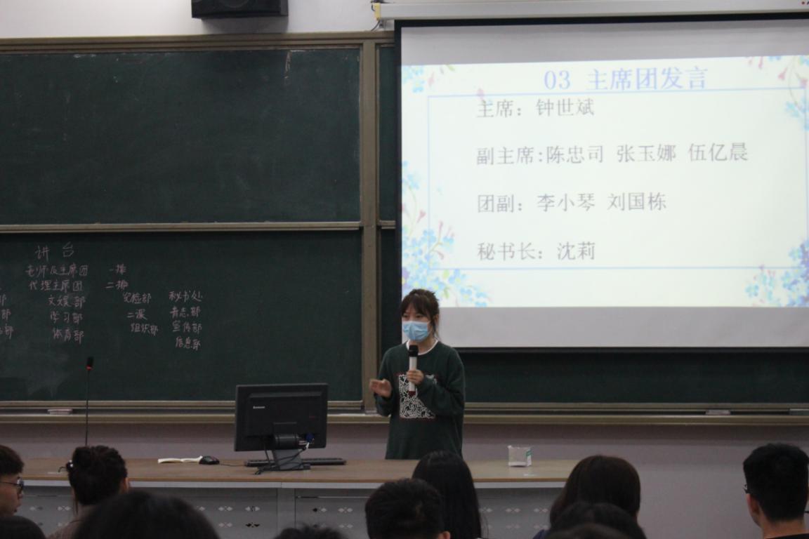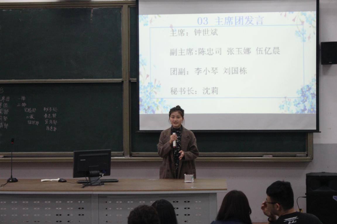 大会第二项是由18级主席团成员分别上台发言。首先发言的是副主席陈忠司同学,他用激情昂扬的语言讲了以下两点:一、对19级留干成员表示感谢,感谢她们愿意留下来为外语系出一份力;二、动员大家充满信心迎接接下来的每一份工作。随后团副刘国栋同学用幽默有趣的方式告诉代理干部们不要带官僚气息,而是要一心一意、勤勤恳恳为同学们、为外语系服务,更需要明白团结的重要性,让外语系的的团结之风一届一届传递下去。团副李晓琴同学和秘书长沈莉同学也表示对新一届干部的欢迎,也分别把“完成优先于完美”“学习天天向上,身体健健康康”的工作经验和美好祝愿送给同学们。