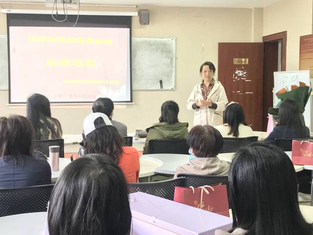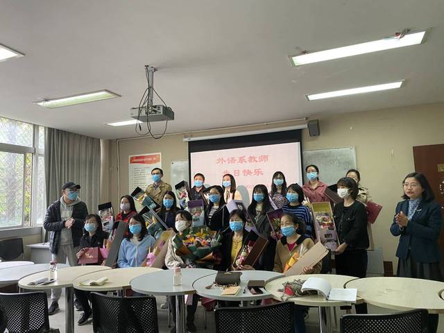 2020年4月21日下午,在外语系教职工大会上,外语系分工会为今年2月、3月、4月过生日的老师们献上祝福。特殊时期,口罩不能遮挡集体的温情,鲜花映衬了老师们眼中的笑意,在生日快乐歌声中,大家都深深地感受到了外语系分工会对每位老师的关心和守护。这次生日庆祝活动,也有特殊的一面,因为外语系将送别一位好榜样、好同事、好老师——郑霄雯老师。郑老师在今年光荣退休,在38年的教书生涯中,她一直能坚守传道授业的信念并坚持对教育事业的热爱。她的退休感言就是对守正初心、身正为范的写照,让大家感慨时光不是让人痴长年岁而是使人内涵气度。