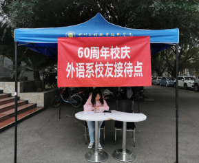外语系师生作为工院一份子,积极配合学校安排。于当日上午10:00在二号教学楼的语言中心门口外设置“60周年校庆--外语系校友接待点”,同学们自发组织志愿者在接待处迎接校友,充满朝气的笑容让从四面八方归来的校友重温母校的温暖与亲切。