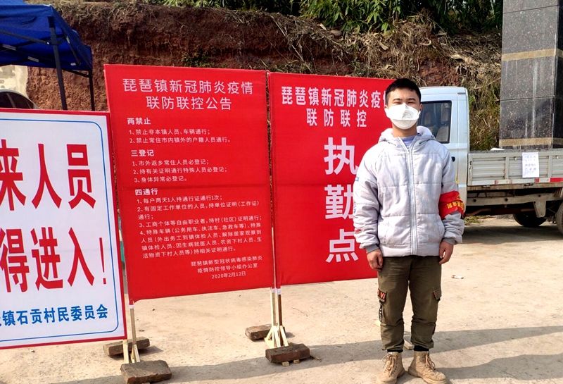 2019级机械制造与自动化3班甘功灿在乡自贡市富顺县琵琶镇石贡村村委会的号召,积极主动参加防疫工作——在村各处要道协助检查来往人员(身份登记,测量体温),发放宣传手册。他说:“作为一名入党积极分子,我愿意为我们村所有人的健康守好大门,疫情不退,我不退!”
