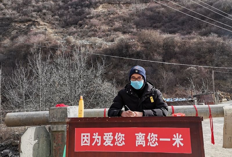 2019商务英语2班腾超,参加家乡阿坝州小金县抚边乡粮台村的抗击疫情工作——在村防疫卡点执勤,守护家乡。