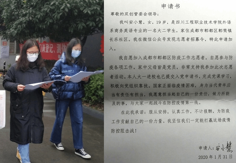 1月31日,2018商务英语1班安小慧写下申请书,请战加入成都市郫都区双创管委会抗击疫情志愿者队伍。这些天她一直战斗在基层防控的一线。她说:“现在国家正面临疫情困难,身为当代青年应当有责任有担当,我是一名入党积极分子,我愿意担当起自己的一份责任,做力所能及的事,与大家一起战斗在防控疫情第一线。”