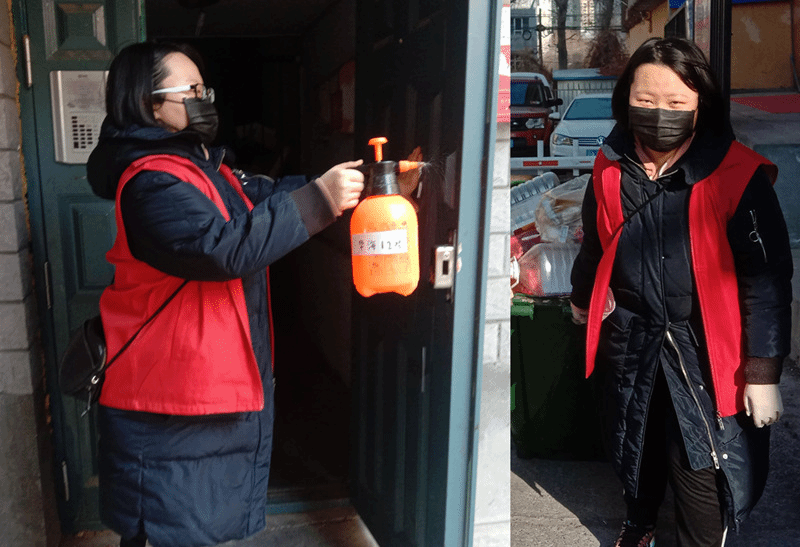 2019级外语系商务英语2班王思睿,参加家乡新疆维吾尔自治区乌鲁木齐市新民西街社区的防疫工作——每日进行公共区域消毒,宣传防疫知识,为社区居民提供便利服务。