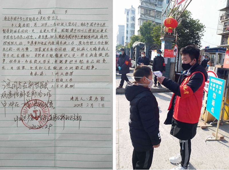 2月初,2019机电一体化技术4班袁浩均请战加入南充市阆中市七里开发区张公桥社区街道办事处防疫站工作。他说:“作为一名在校大学生,作为一名入党积极分子,我就要担当起自己的责任,为国家、社会和人民做力所能及的事。”