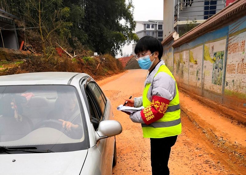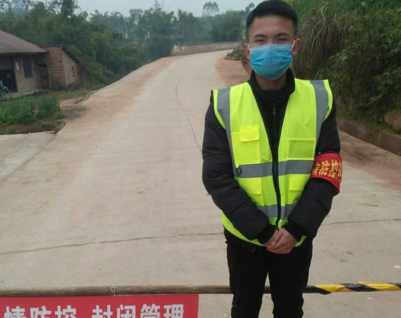 2019城市轨道交通机电技术1班的卢天祥, 2月15日至今参加宜宾市翠屏区白花镇东林村的志愿服务队,主要负责村组路口卡点对进出车辆进行消毒,协助社长发放酒精,登记外来车辆车牌及核实人员信息。