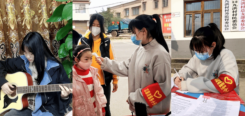 2019级应用英语1班的李洁,主动报名成为自贡市沿滩区九洪乡一名抗疫志愿者。每日上午八点半到岗,上街巡逻挨家挨户进行防疫知识宣讲,登记外出返回人员自主隔离情况,并在卡点执勤。她说:“无论刮风下雨,我们一直坚守岗位。我们不怕苦不怕累,能够为家乡做点事,得到村民乡亲的认同,就是我们最大的幸福。”