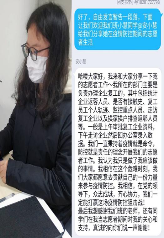 此外,更值得一提的是,来自2018级商务英语1班的安小慧同学和2019级商务英语1班的舒琪珂等同学在自己家所在社区做的志愿者活动。作为一名团员,秉承着疫情就是命令,防控就是责任的理念,他们认为只是做了自己应该做的事情。他们的分享获得了老师们的肯定以及同学们的点赞!