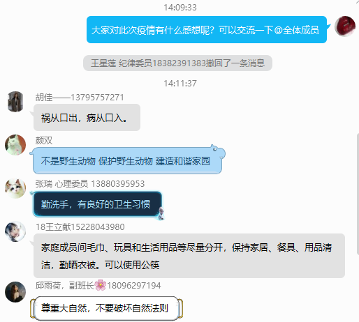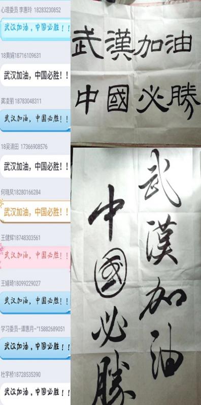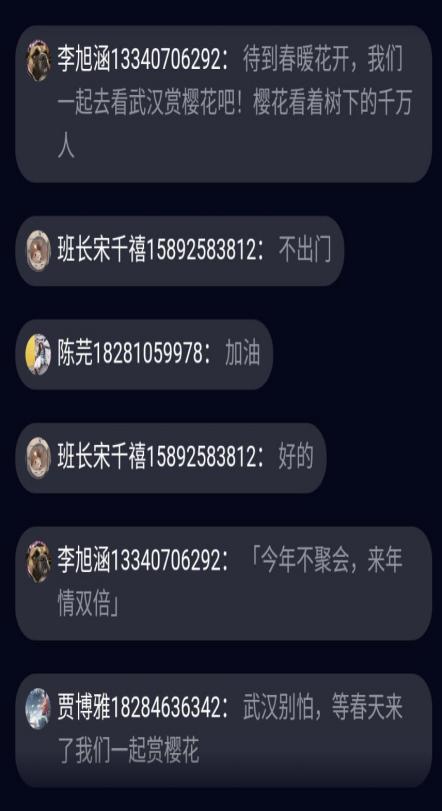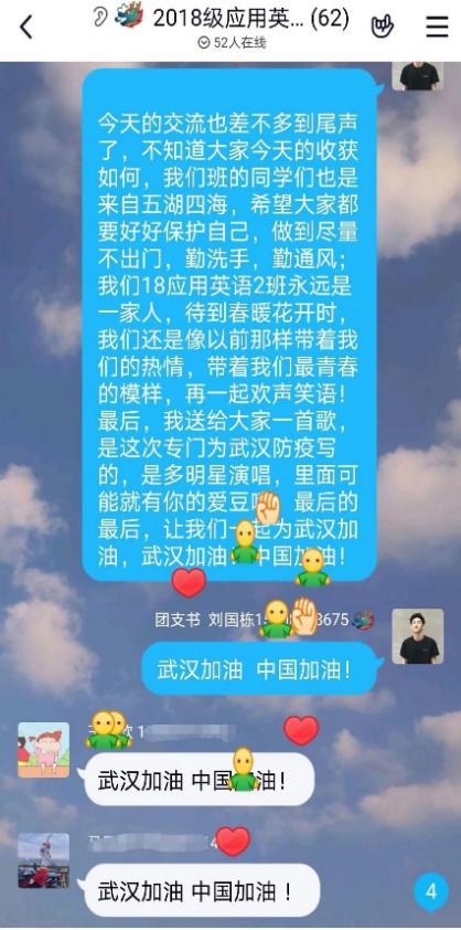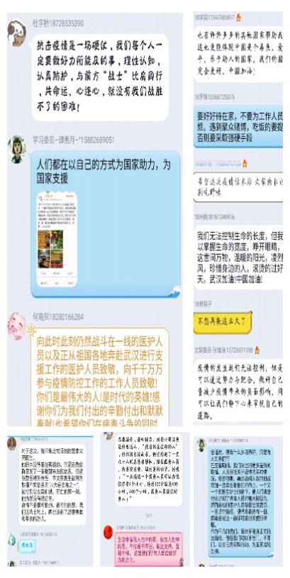 在每一个班级团支部的网上团课尾声之际,每一位同学都表达了自己对武汉,对祖国的鼓舞和祝福,每一位同学都充分认识到自己肩负的使命与责任。虽然是苍白的文字,但每一个字,每一句呐喊都是大家最真挚而诚恳的祝愿与期盼!