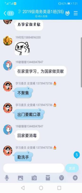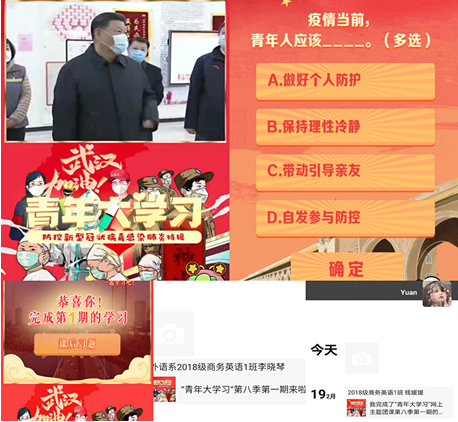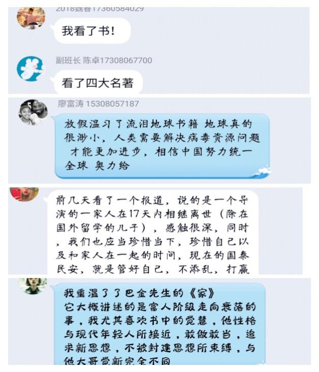 除此之外,我系各班级团支部成员在疫情防控期间,合理安排时间,利用现有的各类网络学习平台,阅读经典,学好专业知识,认真完成学习任务。2018级和2019级应用英语2班的同学都分别在各自的班群里晒出了自己学习时的照片,也有的团支部在群里就自己假期所看过的好书进行了点评与推荐,他们真正做到了“离校不离教,停课不停学”,值得表扬与学习!