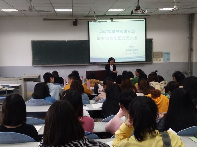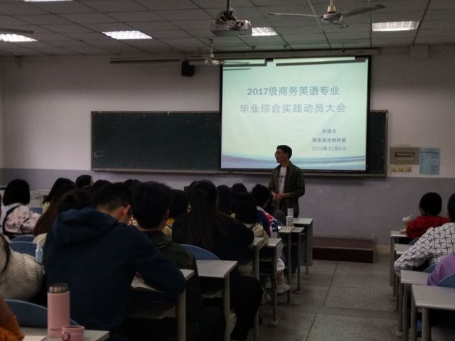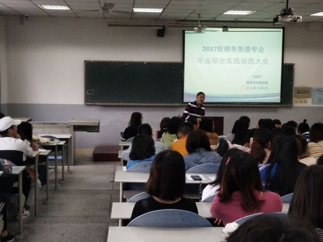 为迎接即将到来的“毕业季”,加强对于17级应届毕业生业务素养和综合能力的锻炼和培育,2019年10月8日外语系商务英语一班、二班的同学于3A202教室召开了一次毕业综合实践动员大会。