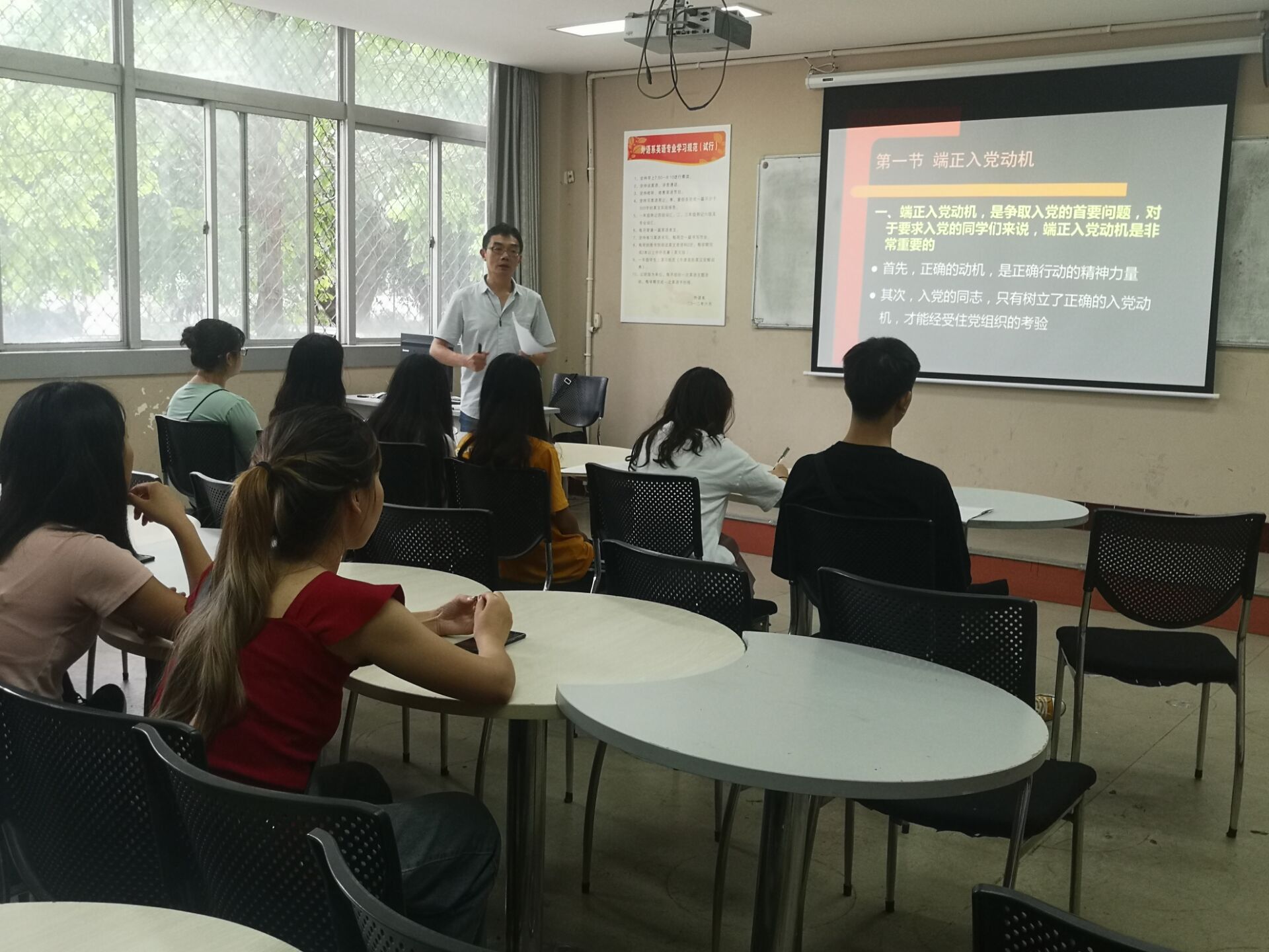 为帮助同学们树立正确的入党动机,争取早日加入的党组织,本学期最后一次党课于2019年6月20日在二教语言中心开展。本次党课学习由外语系党总支书记卢敏老师主讲,外语系各班团支书及班长同本学期党课学员一同参加学习。