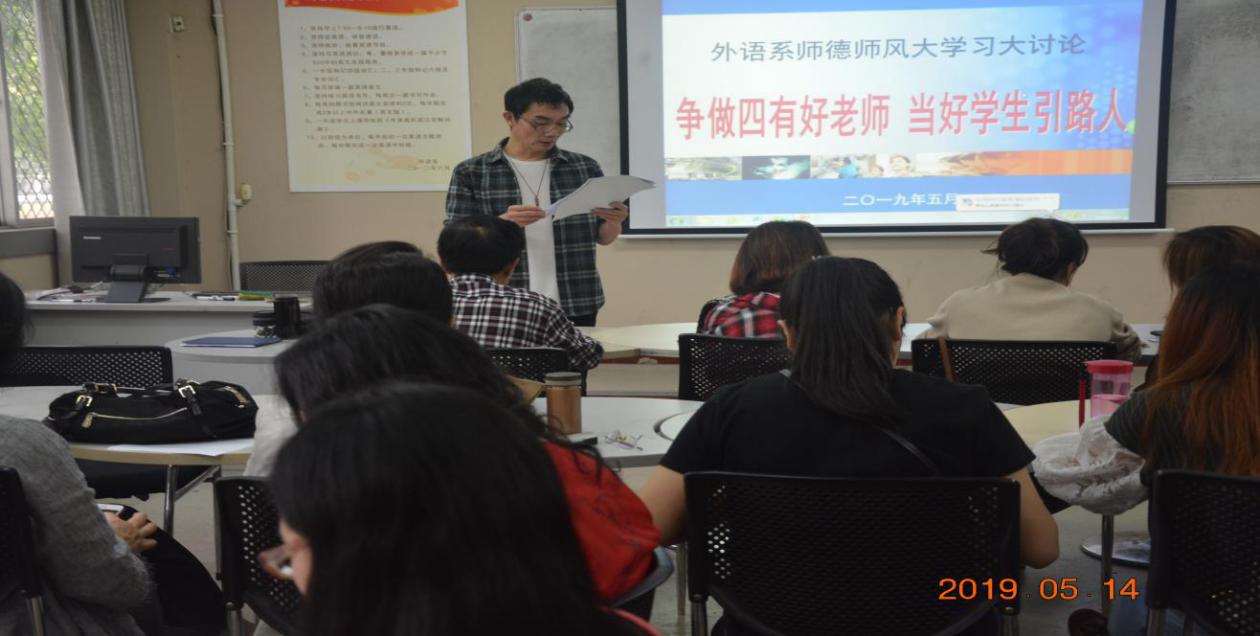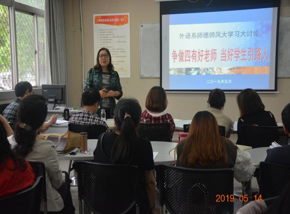 根据学校纪委下发的“关于开展师德师风大学习大讨论活动的通知”的部署,按照系党总支的安排,2019年5月14日下午3:00,外语系全体教职员工在我院二教语言中心一教室,利用政治学习时间,开展了以“争做四好老师 当好学生引路人”为主题的外语系师德师风大学习大讨论活动。系党总支书记卢敏老师主持。