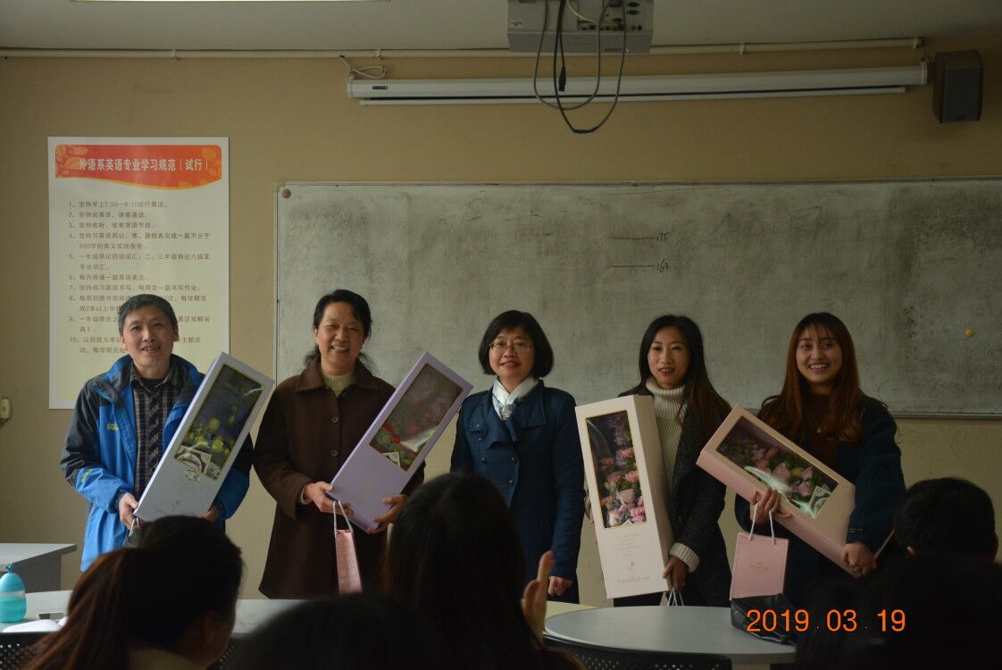 2019年3月19日下午在语言中心外语系教职工大会上,外语系分工会为3月份过生日的老师献上了鲜花和巧克力,全体老师齐唱生日快乐歌,祝福他们生日快乐!大家都深深地感受到了外语系分工会对每位老师的关心和浓浓的爱意。