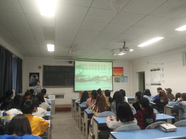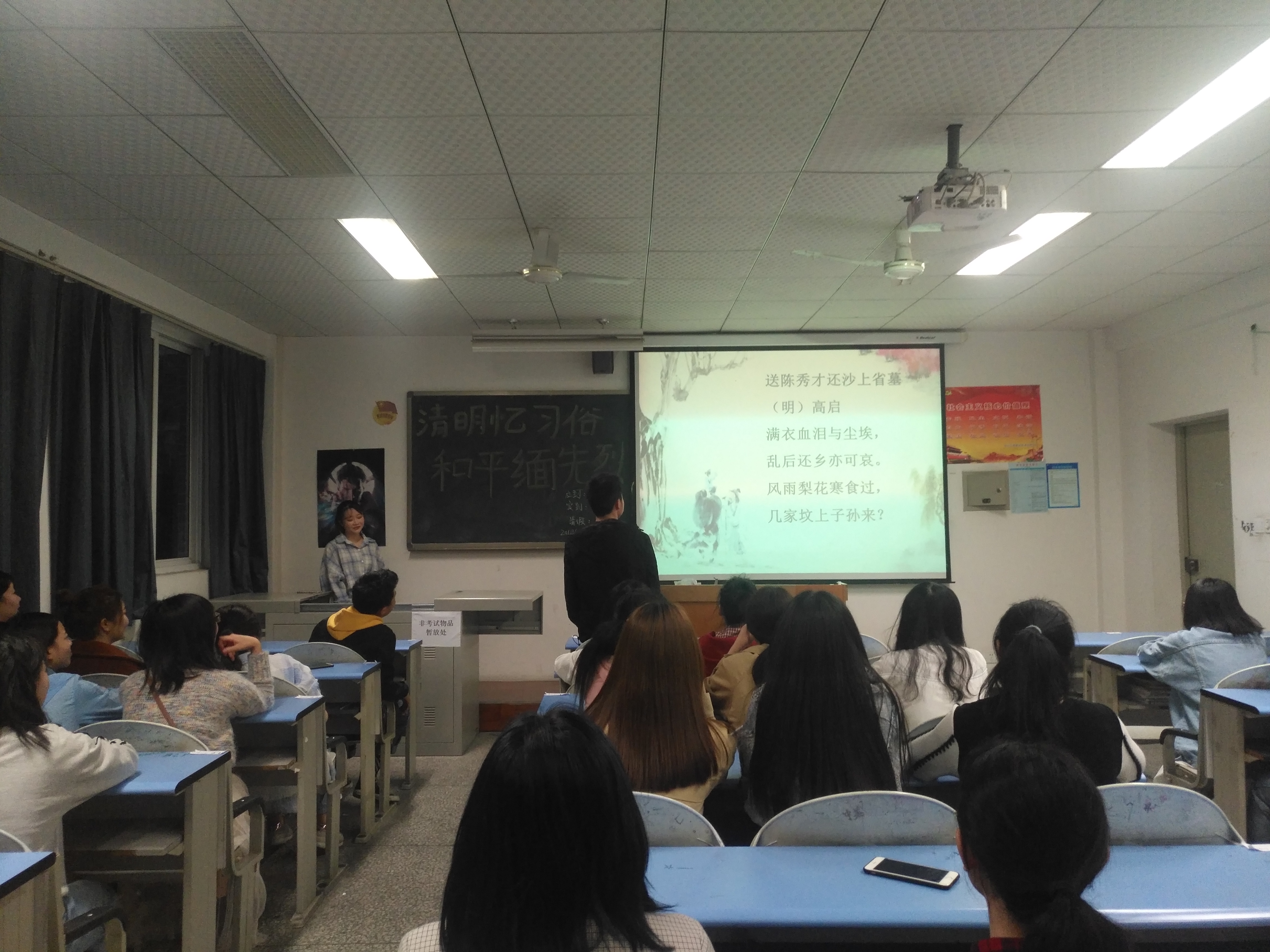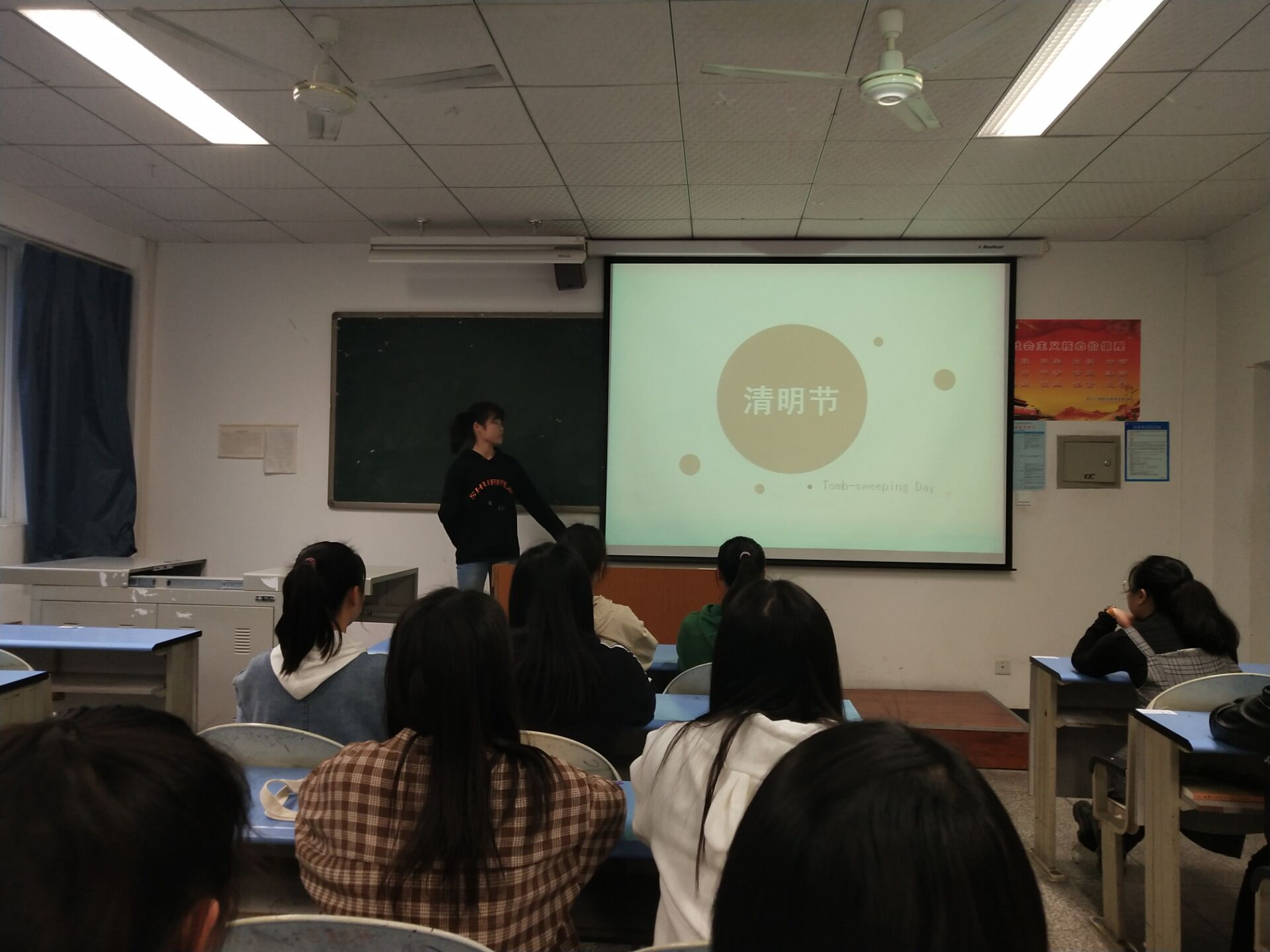 清明节在春的怀抱中悄悄走来,为弘扬中华传统文化,增强学生民俗意识,追忆革命先烈精神,感恩当下幸福生活,外语系各班于3月31日晚在各班教室开展了“清明忆习俗传承文化,和平缅先烈感恩逐梦”主题班会活动。 商务英语专业的同学们在班长的带领下,通过让同学们积极发言与清明节相关的诗句和习俗,更深入了解清明节,本次主题班会顺利开展。应用英语专业的同学们在各班团支书的组织下,通过一些趣味活动和清明节知识问答的形式,极大地带动同学们的积极性,让同学们进一步了解到清明节的相关习俗。