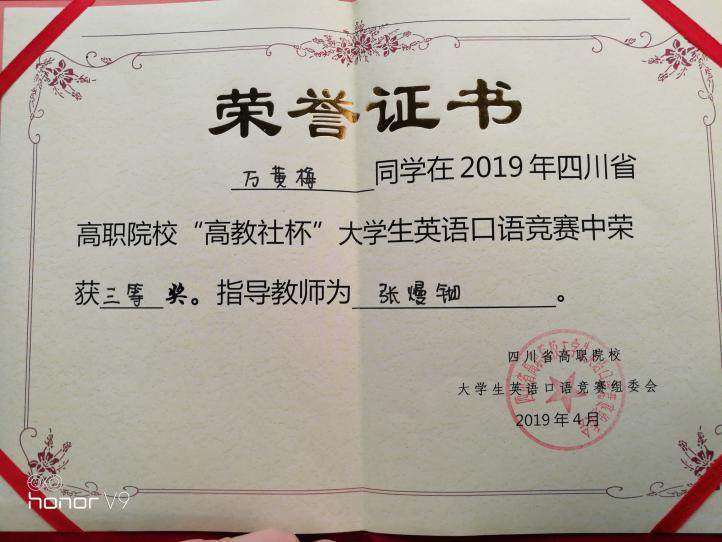 我系应用英语专业2017级学生万黄梅经过寒假训练、开学后激烈的校内选拔,代表我院参加此次比赛,最终以优异的成绩荣获英语专业组三等奖。